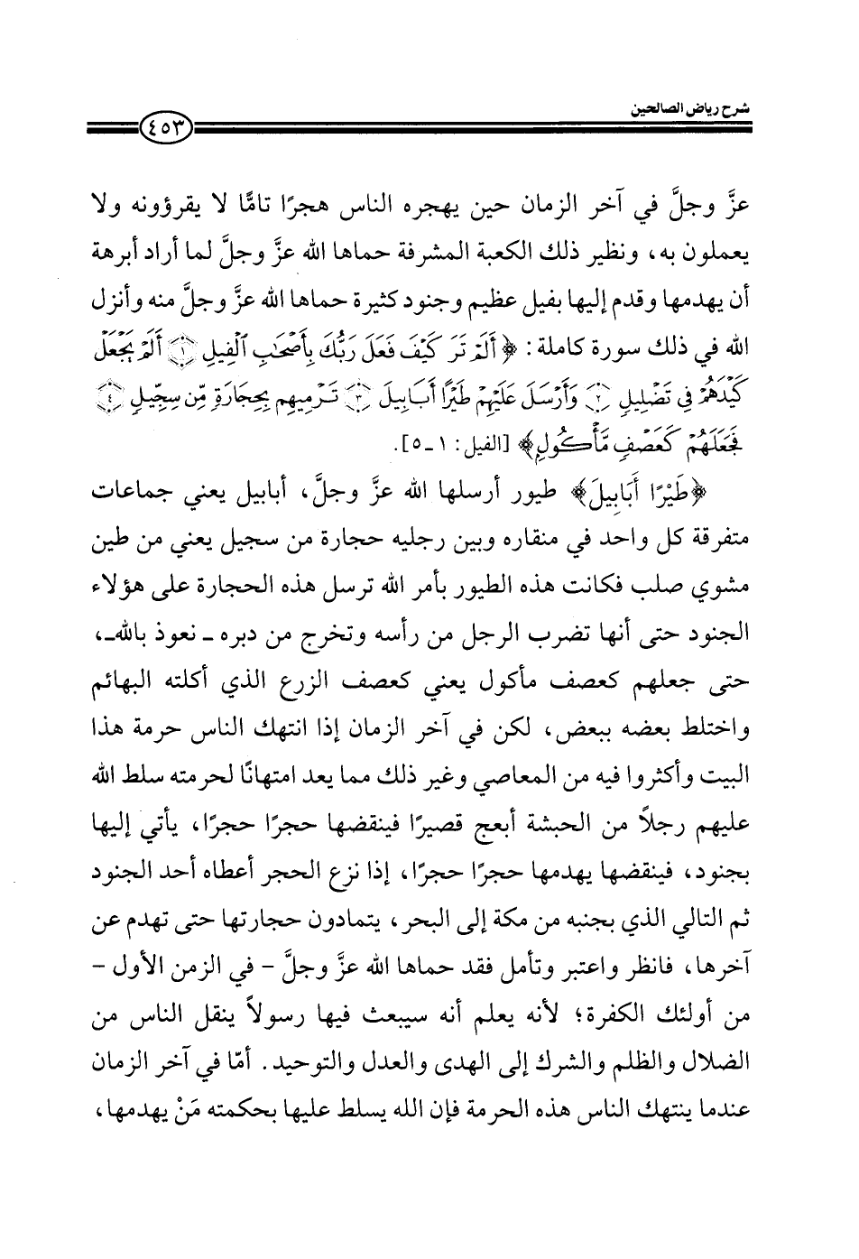 عز وجل في آخر الزمان حين يهجره الناس هجرا تاما لا يقرؤونه ولا يعملون به ونظير ذلك الكعبة المشرفة حماها الله عز وجل لما أراد أبرهة أن يهدمها وقدم إليها بفيل عظيم وجنود كبيرة حماها الله عز وجل منه وأنزل الله في ذلك سورة كاملة ألم تر كيف فعل ربك بأصحاب الفيل ألم يجعل كيدهم في تضليل وأرسل عليهم طيرا أبابيل ترميهم بحجارة من سجيل فجعلهم كعصف مأكول طيور أرسلها الله عز وجل أبابيل يعني جماعات متفرقة كل واحد في منقاره وبين رجليه حجارة من سجيل يعني من طين صلب فكانت هذه الطيور بأمر الله ترسل هذه الحجارة على هؤلاء الجنود حتى أنها تضرب الرجل من رأسه وتخرج من دبره نعوذ بالله حتى جعلهم كعصف مأكول يعني كعصف الزرع الذي أكلته البهائم واختلط بعضه ببعض لكن في آخر الزمان إذا انتهك الناس حرمة هذا البيت واكثروا فيه من المعاصي وغير ذلك مما يعد امتهانا لحرمته سلط الله عليهم رجلا من الحبشة أفحج الرجلين قصير فينقضها حجرا حجرا يأتي إليها بجنود فينقضها يهدمها حجرا حجرا إذا نزع الحجر أعطاه أحد الجنود ثم التالي الذي بجنبه من مكة إلى البحر يتمادون حجارتها حتى تهدم عن آخرها فانظر كان في الأول حماها الله عز وجل من أولئك الكفرة لأنه يعلم أنه سيبعث فيها رسولا ينقل الناس من الضلال والظلم والشرك إلى الهدى والعدل والتوحيد.