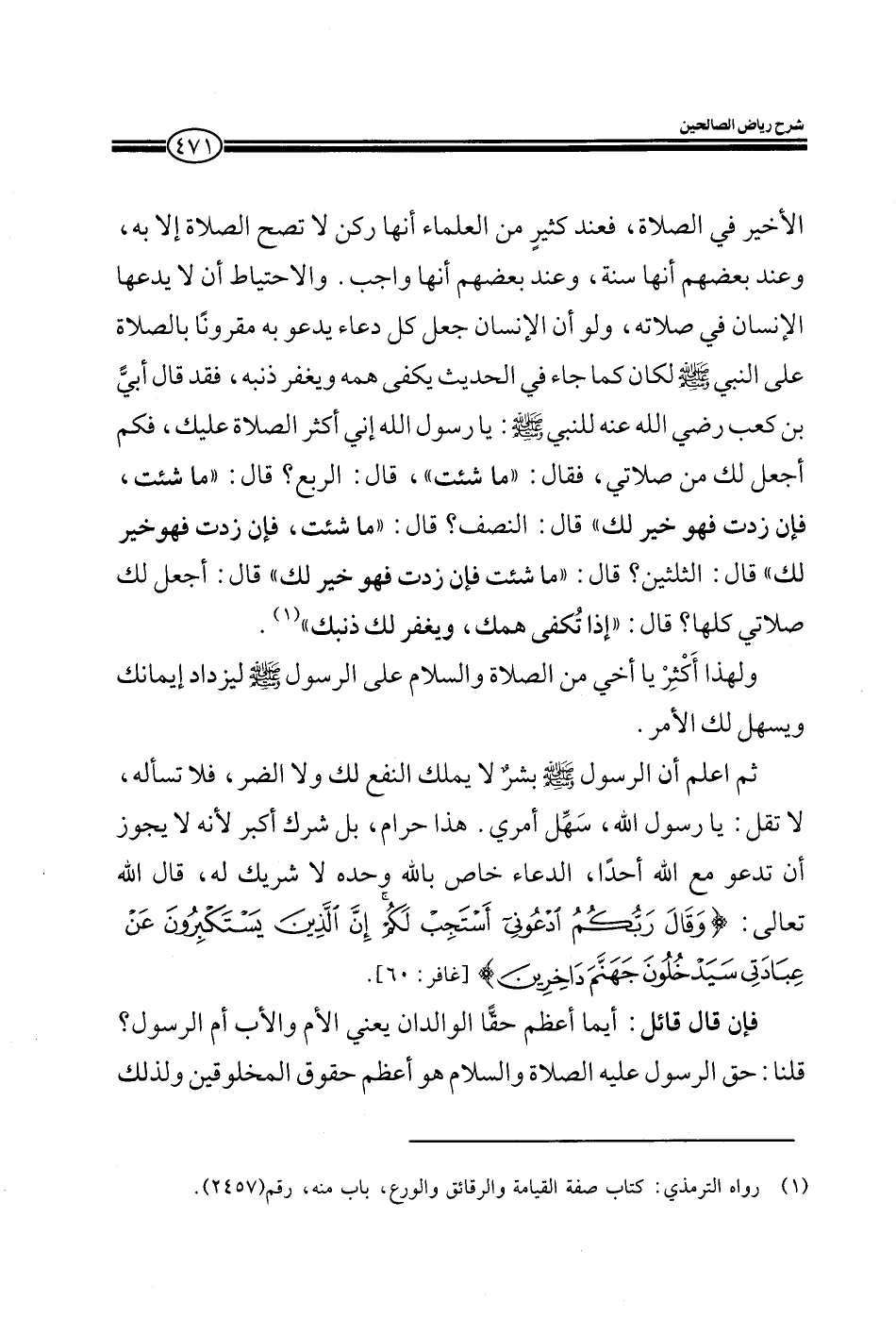ولهذا أكثر يا أخي من الصلاة والسلام على الرسول ليزداد إيمانك ويسهل لك الأمر ثم اعلم أن الرسول صلى الله عليه وسلم بشر لا يملك النفع لك ولا الضر فلا تسأله لا تقول يا رسول الله افعل كذا يا رسول الله استغفر لي يا رسول الله أغثني يا رسول الله سهل أمري هذا حرام شرك أكبر لأنه لا يجوز أن تدعو مع الله أحدا الدعاء خاص بمن بالله قال تعالى {وقال ربكم ادعوني أستجب لكم إن الذين يستكبرون عن عبادتي سيدخلون جهنم داخرين} فإن قال قائل أيما أعظم حقا الوالدان يعني الأم والأب أم الرسول؟ الرسول أعظم من حق نفسك عليك ولهذا يجب على الإنسان أن يفدي نفسه للرسول