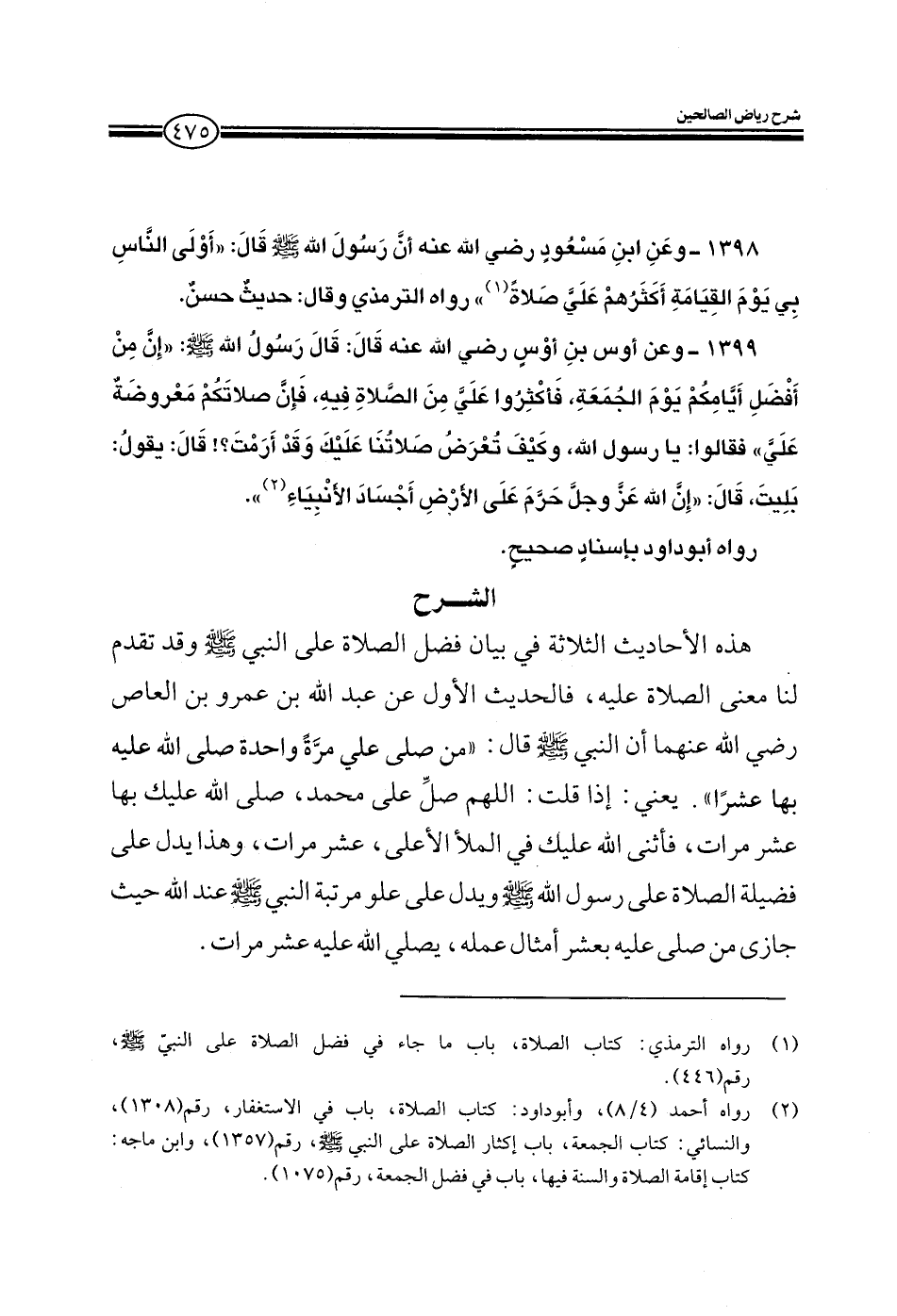 1399 - وعن أوس بن أوس رضي الله عنه قال قال رسول الله صلى الله عليه وسلم إن من أفضل أيامكم يوم الجمعة فأكثروا علي من الصلاة فيه فإن صلاتكم معروضة علي فقالوا يا رسول الله وكيف تعرض صلاتنا عليك وقد أرمت يقول بليت قال إن الله حرم على الأرض أجساد الأنبياء رواه أبو داود بإسناد صحيح.