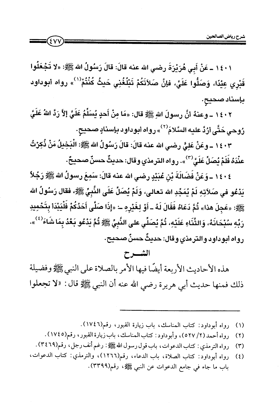 1401 - وعن أبي هريرة رضي الله عنه قال قال رسول الله صلى الله عليه وسلم لا تجعلوا قبري عيدا وصلوا علي فإن صلاتكم تبلغني حيث كنتم رواه أبو داود بإسناد صحيح.