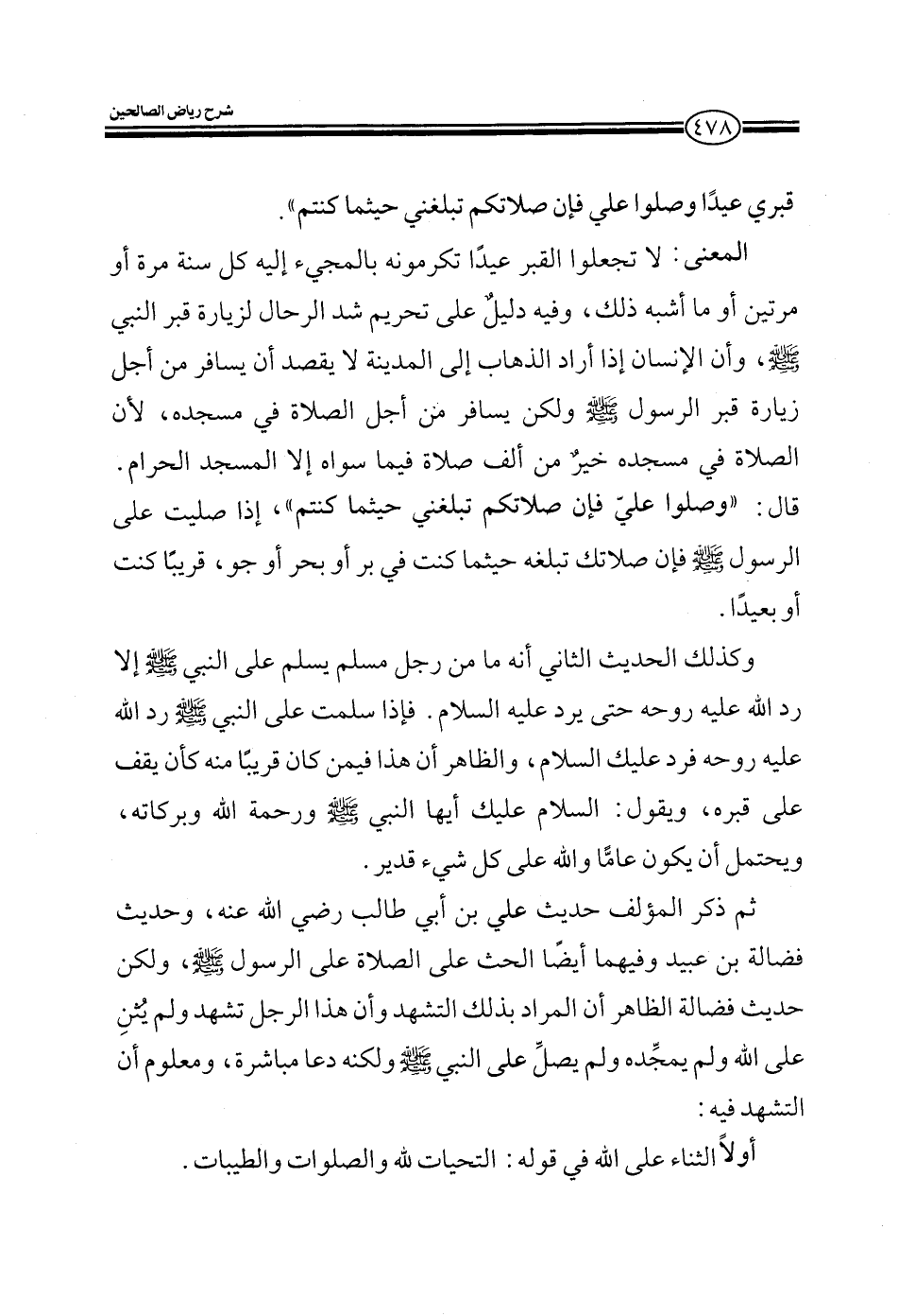 المعنى لا تجعلوا القبر عيدا تكرمونه بالمجيء إليه كل سنة مرة أو مرتين أو ما أشبه ذلك وفيه دليل على تحريم شد الرحل لزيارة قبر النبي صلى الله عليه وسلم وأن الإنسان إذا أراد الذهاب إلى المدينة لا يقصد أن يسافر من أجل زيارة قبر الرسول ولكن يسافر من أجل الصلاة في مسجده لأن الصلاة في مسجده خير من ألف صلاة فيما سواه إلا المسجد الحرام قال وصلوا علي فإن صلاتكم تبلغني حيثما كنتم إذا صليت على الرسول صلى الله عليه وسلم فإن صلاتك تبلغه حيثما كنت في بر أو بحر أو جو قريبا كنت أو بعيدا وكذلك الحديث الثاني أنه ما من رجل مسلم يسلم على النبي صلى الله عليه وسلم إلا رد الله عليه روحه حتى يرد عليه السلام فإذا سلمت على النبي صلى الله عليه وسلم رد الله عليه روحه فرد عليك السلام والظاهر أن هذا فيمن كان قريبا منه كأن يقف على قبره ويقول السلام عليك أيها النبي ورحمة الله وبركاته ويحتمل أن يكون عاما والله على كل شيء قدير.