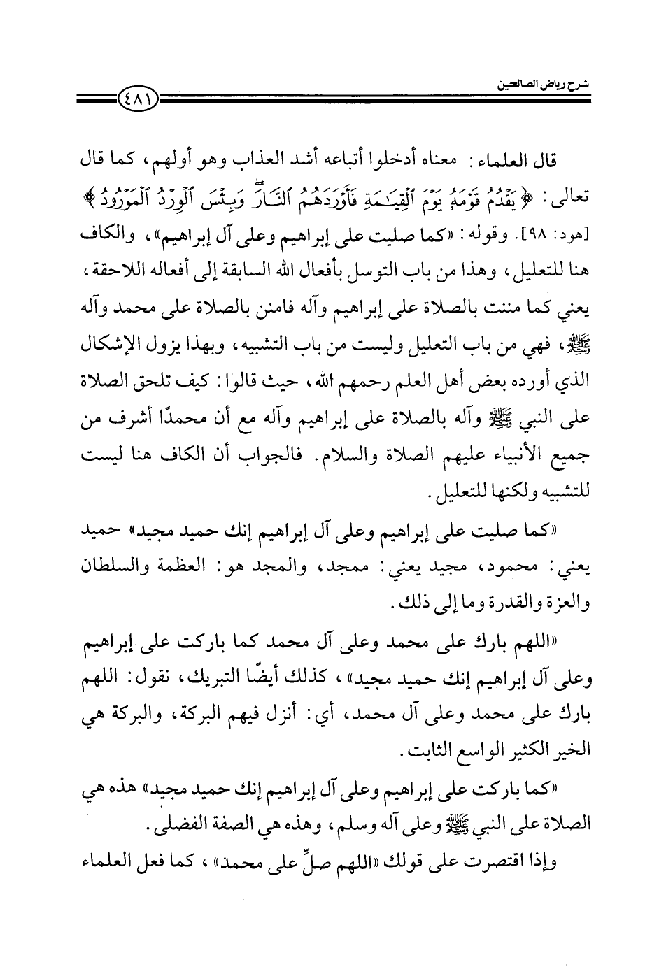 قال العلماء معناه أدخلوا أتباعه أشد العذاب وهو أوله كما قال تعالى {يقدم قومه يوم القيامة فأوردهم النار وبئس الورد المورود} وقوله كما صليت على إبراهيم وعلى آل إبراهيم الكاف هنا للتعليل وهذا من باب التوسل بأفعال الله السابقة إلى أفعاله اللاحقة يعني كما مننت بالصلاة على إبراهيم وآله فامنن بالصلاة على محمد وآله صلى الله عليه وسلم فهي من باب التعليل وليست من باب التشبيه وبهذا يزول الإشكال الذي أورده بعض أهل العلم رحمهم الله حيث قالوا كيف تلحق الصلاة على النبي صلى الله عليه وسلم وآله بالصلاة على إبراهيم وآله مع أن محمد أشرف من جميع الأنبياء عليهم الصلاة والسلام فالجواب أن الكاف هنا ليست للتشبيه ولكنها للتعليل كما صليت على إبراهيم وعلى آل إبراهيم إنك حميد مجيد حميد يعني محمود مجيد يعني ممجد والمجد هو العظمة والسلطان والعزة والقدرة وما إلى ذلك اللهم بارك على محمد وعلى آل محمد كما باركت على إبراهيم وعلى آل إبراهيم إنك حميد مجيد كذلك أيضا التبريك تقول اللهم بارك على محمد وعلى آل محمد أي أنزل فيهم البركة والبركة هي الخير الكثير الواسع الثابت كما باركت على إبراهيم وعلى آل إبراهيم إنك حميد مجيد هذه هي الصلاة على النبي صلى الله عليه وسلم وعلى آله وسلم وهذه هي الصفة الفضلى وإذا اقتصرت على قولك اللهم صل على محمد كما فعل العلماء