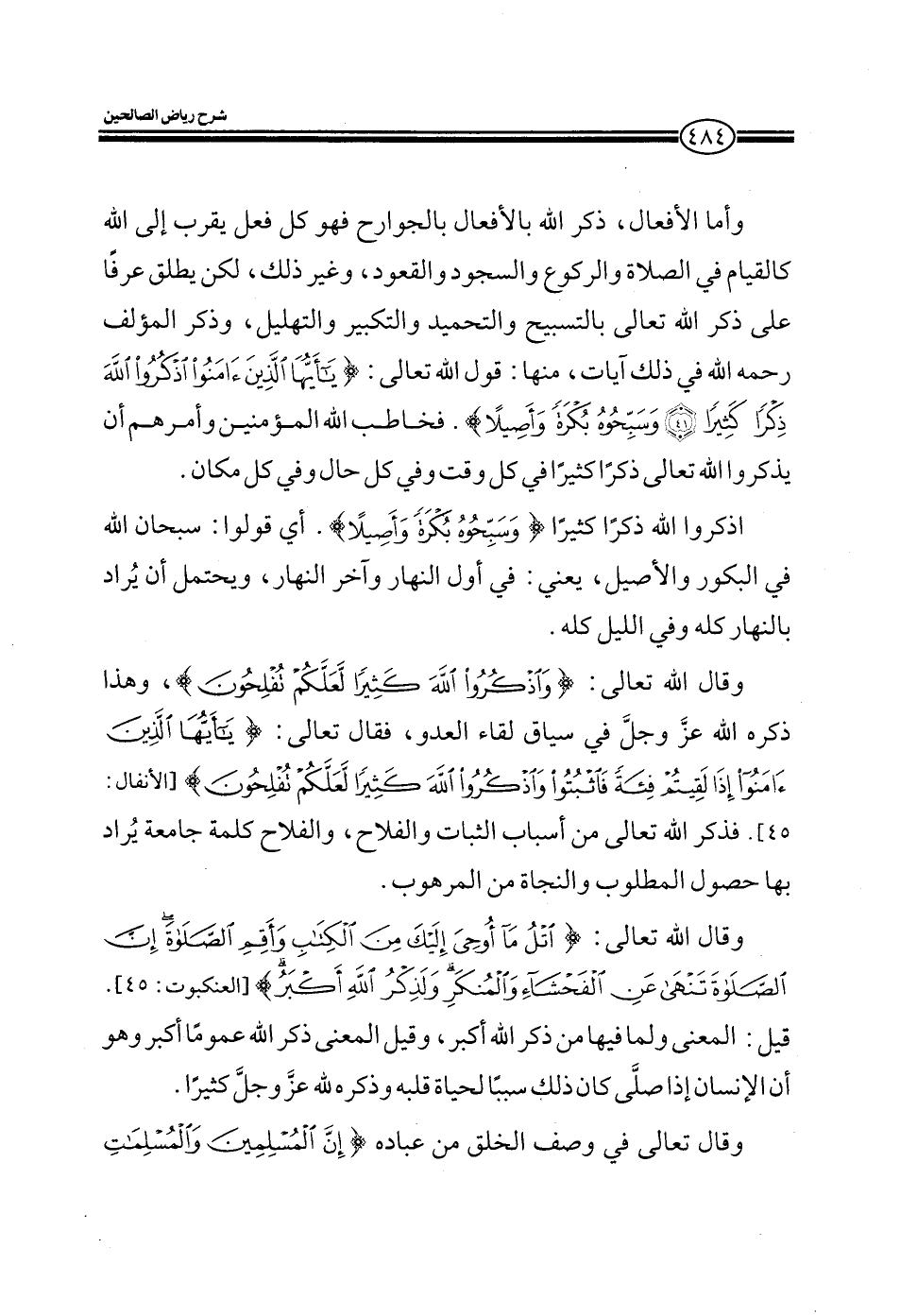 وأما ذكر الله بالأفعال فهو ذكر الله بالجوارح فهو كل فعل يقرب إلى الله كالقيام في الصلاة والركوع والسجود والقعود وغير ذلك لكن يطلق عرفا على ذكر الله تعالى التسبيح والتحميد والتكبير والتهليل وذكر المؤلف رحمه الله في ذلك آيات منها قول الله تعالى يا أيها الذين آمنوا اذكروا الله ذكرا كثير وسبحوه بكرة وأصيلا فخاطب الله المؤمنين وأمرهم أن يذكروا الله تعالى ذكرا كثيرا في كل وقت وفي كل حال وفي كل مكان اذكر الله ذكرا كثيرا {وسبحوه بكرة وأصيلا} أي قولوا سبحان الله في البكور والأصيل يعني في أول النهار وآخر النهار ويحتمل أن يراد بالنهار كله وفي الليل كله وقال الله تعالى {واذكروا الله كثيرا لعلكم تفلحون} وهذا ذكره الله عز وجل في سياق لقاء العدو فقال تعالى {يا أيها الذين آمنوا إذا لقيتم فئة فاثبتوا واذكروا الله كثيرا لعلكم تفلحون} فذكر الله تعالى من أسباب الثبات والفلاح والفلاح كلمة جامعة يراد بها حصول المطلوب والنجاة من المرهوب وقال الله تعالى {اتل ما أوحي إليك من الكتاب وأقم الصلاة إن الصلاة تنهى عن الفحشاء والمنكر ولذكر الله أكبر} قيل المعنى ولما فيها من ذكر الله أكبر وقيل المعنى ذكر الله عموما أكبر وهو أن الإنسان إذا صلى كان ذلك سببا لحياة قلبه وذكره لله عز وجل كثيرا وقال تعالى في وصف الخلق من عباده {إن المسلمين والمسلمات