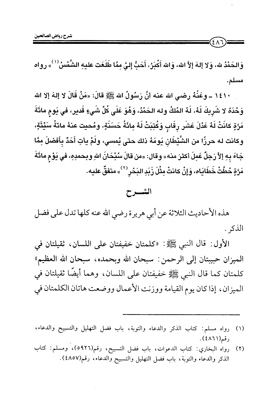 1410 - وعنه أن رسول الله صلى الله عليه وسلم قال من قال لا إله إلا الله وحده لا شريك له له الملك وله الحمد وهو على كل شيء قدير في يوم مائة مرة كانت له عدل عشر رقاب وكتبت له مائة حسنة ومحيت عنه مائة سيئة وكانت له حرزا من الشيطان يومه ذلك حتى يمسي ولم يأت أحد بأفضل مما جاء به إلا رجل عمل أكثر منه وقال من قال سبحان الله وبحمده في يوم مائة مرة حطت خطاياه وإن كانت مثل زبد البحر متفق عليه.