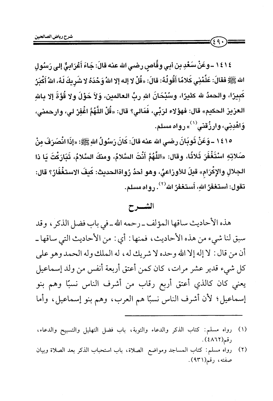 1414 - وعن سعد بن أبي وقاص رضي الله عنه قال جاء أعرابي إلى رسول الله صلى الله عليه وسلم فقال علمني كلاما أقوله قال قل لا إله إلا الله وحده لا شريك له الله أكبر كبيرا والحمد لله كثيرا وسبحان الله رب العالمين ولا حول ولا قوة إلا بالله العزيز الحكيم قال فهؤلاء لربي فما لي قال قل اللهم اغفر لي وارحمني واهدني وارزقني رواه مسلم.