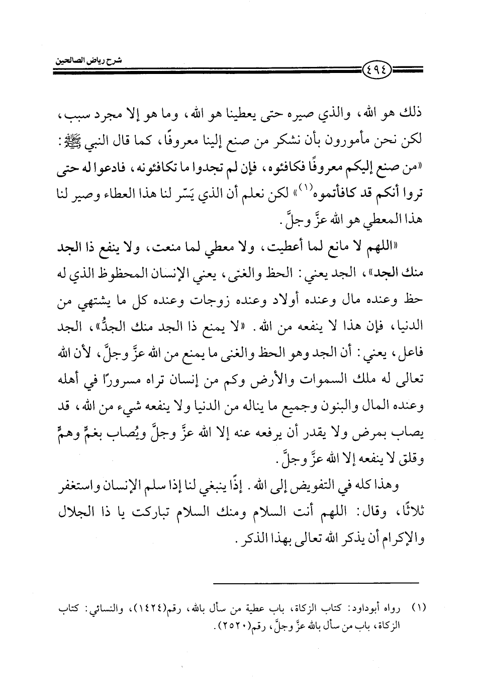 اللهم لا مانع لما أعطيت ولا معطي لما منعت ولا ينفع ذا الجد منك الجد الجد يعني الحظ والغنى يعني الإنسان المحظوظ الذي له حظ وعنده مال وعنده أولاد وعنده زوجات وعنده كل ما يشتهي من الدنيا فإن هذا لا ينفعه من الله لا يمنع ذا الجد منك الجد الجد فاعل يعني أن الجد هو الحظ والغنى ما يمنع من الله عز وجل لأن الله تعالى له ملك السماوات والأرض وكم من إنسان تراه مسرورا في أهله وعنده المال والبنون وجميع ما يناله من الدنيا ولا ينفعه شيء من الله يصاب بمرض ولا يقدر أن يرفعه عنه إلا الله عز وجل يصاب به غم وهم وقلق لا ينفعه إلا الله عز وجل.