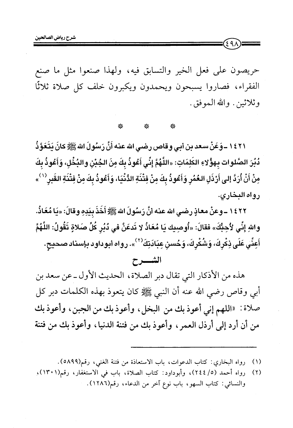 1421 - وعن سعد بن أبي وقاص رضي الله عنه أن رسول الله صلى الله عليه وسلم كان يتعوذ دبر الصلوات بهؤلاء الكلمات اللهم إني أعوذ بك من الجبن والبخل وأعوذ بك من أن أرد إلى أرذل العمر وأعوذ بك من فتنة الدنيا وأعوذ بك من فتنة القبر رواه البخاري