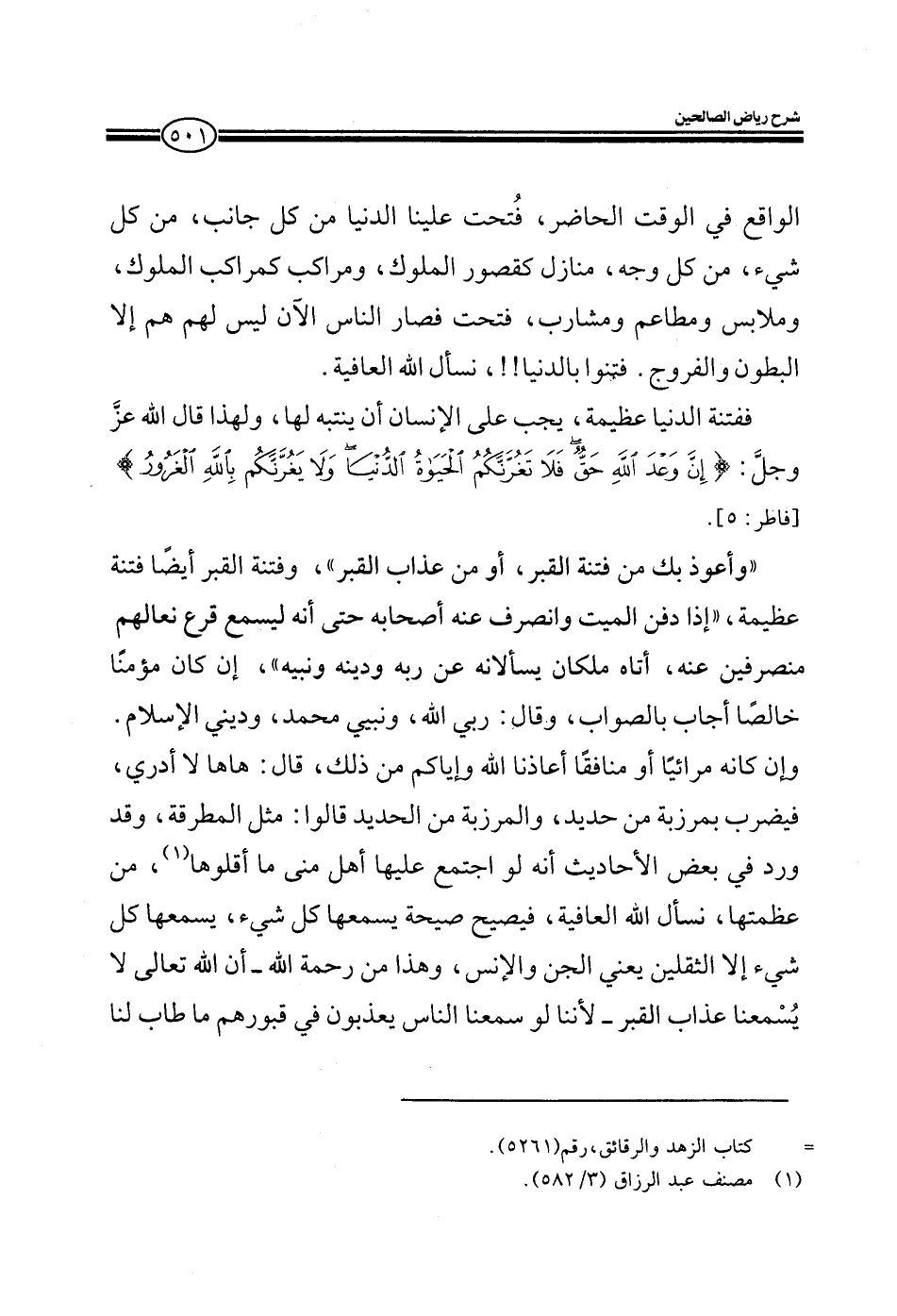 ففتنة الدنيا عظيمة يجب على الإنسان أن ينتبه لها ولهذا قال الله عز وجل إن وعد الله حق فلا تغرنكم الحياة الدنيا ولا يغرنكم بالله الغرور وأعوذ بك من فتنة القبر أو من عذاب القبر وفتنة القبر أيضا فتنة عظيمة إذا دفن الميت وانصرف عنه أصحابه حتى أنه ليسمع قرع نعالهم منصرفين عنه أتاه ملكان يسألانه عن ربه ودينه ونبيه إن كان مؤمنا خالصا أجاب بالصواب وقال ربي الله ونبي محمد وديني الإسلام وإن كان مرائيا أو منافقا أعاذنا الله وإياكم من ذلك قال هاها لا أدري هاها لا أدري فيضرب بمرزبة من حديد المرزبة من الحديد قالوا مثل المطرقة وقد ورد في بعض الأحاديث أنه لو اجتمع عليها أهل منى ما أقلوها من عظمتها نسأل الله العافية فيصيح صيحة يسمعها كل شيء يسمعها كل شيء إلا الثقلين يعني الإنس والجن وهذه من رحمة الله أن الله تعالى لا يسمعنا عذاب القبر لأننا إذا سمعنا الناس يعذبون في قبورهم ما طاب لنا