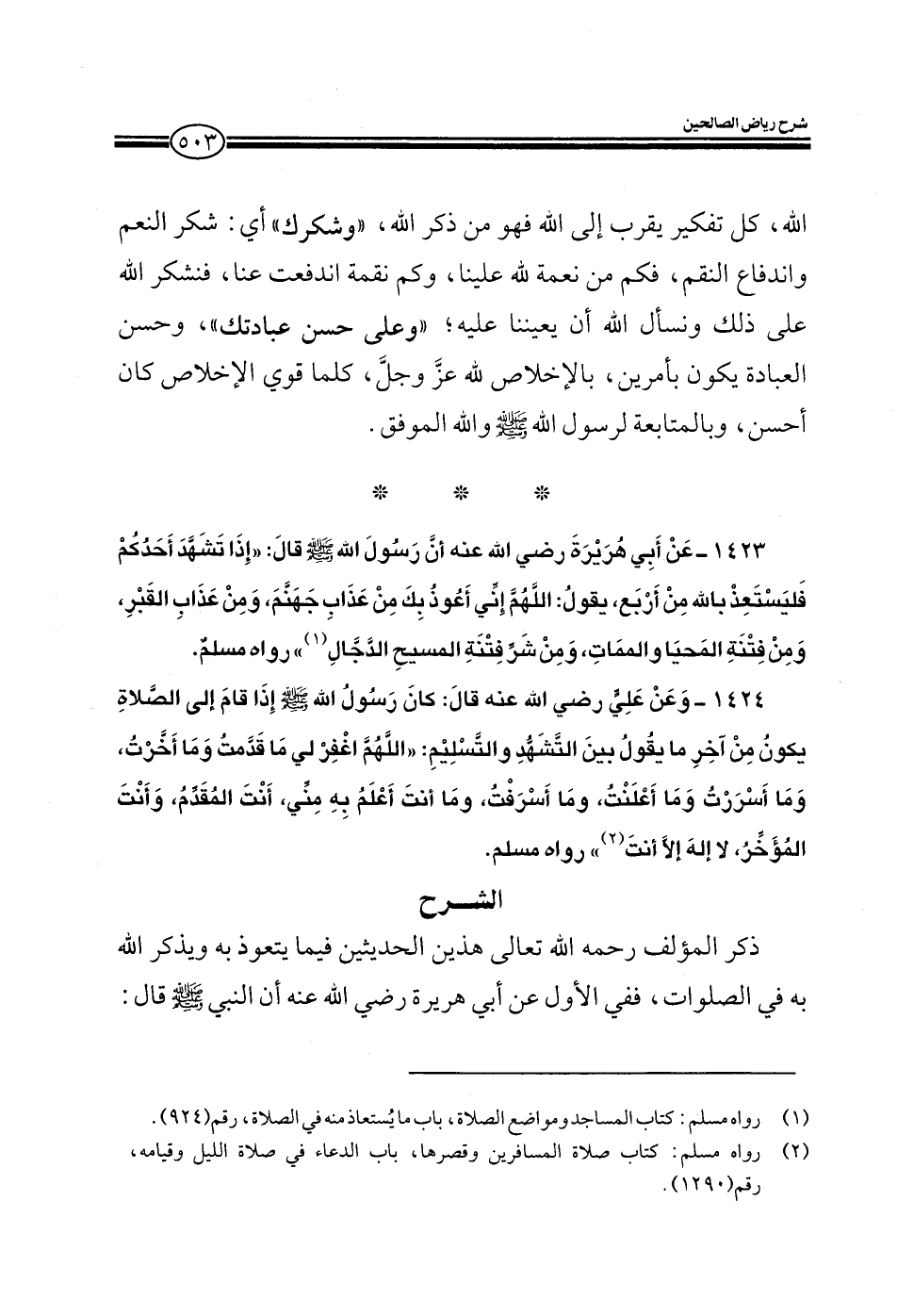 1424 - وعن علي رضي الله عنه قال كان رسول الله إذا قام إلى الصلاة يكون من آخر ما يقول بين التشهد والتسليم اللهم اغفر لي ما قدمت وما أخرت وما أسررت وما أعلنت وما أسرفت وما أنت أعلم به مني أنت المقدم وأنت المؤخر لا إله إلا أنت رواه مسلم.