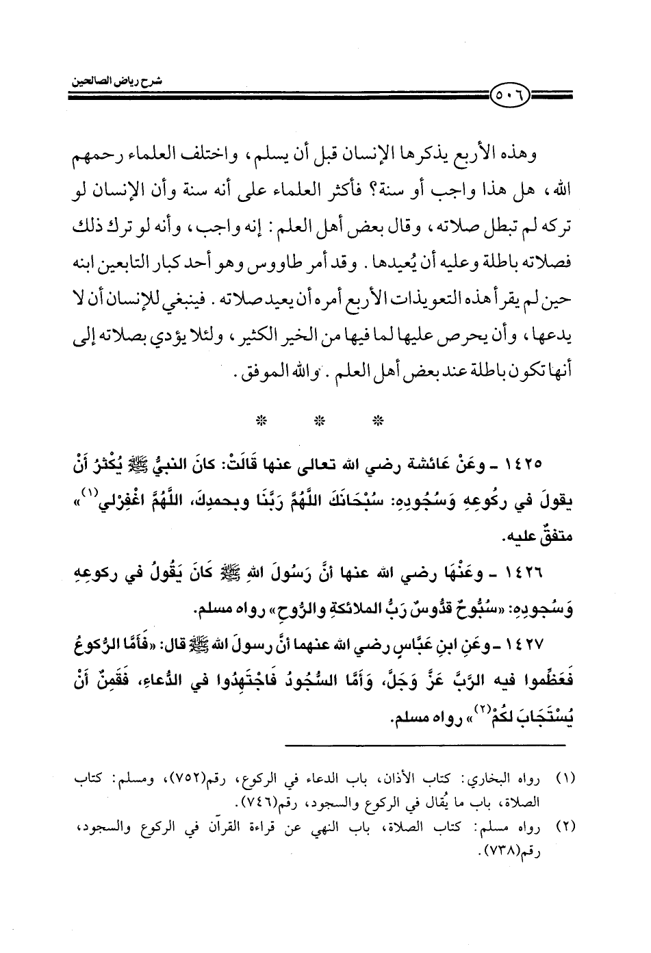1427 - وعن ابن عباس رضي الله عنهما أن رسول الله صلى الله عليه وسلم قال فأما الركوع فعظموا فيه الرب وأما السجود فاجتهدوا في الدعاء فقمن أن يستجاب لكم رواه مسلم.