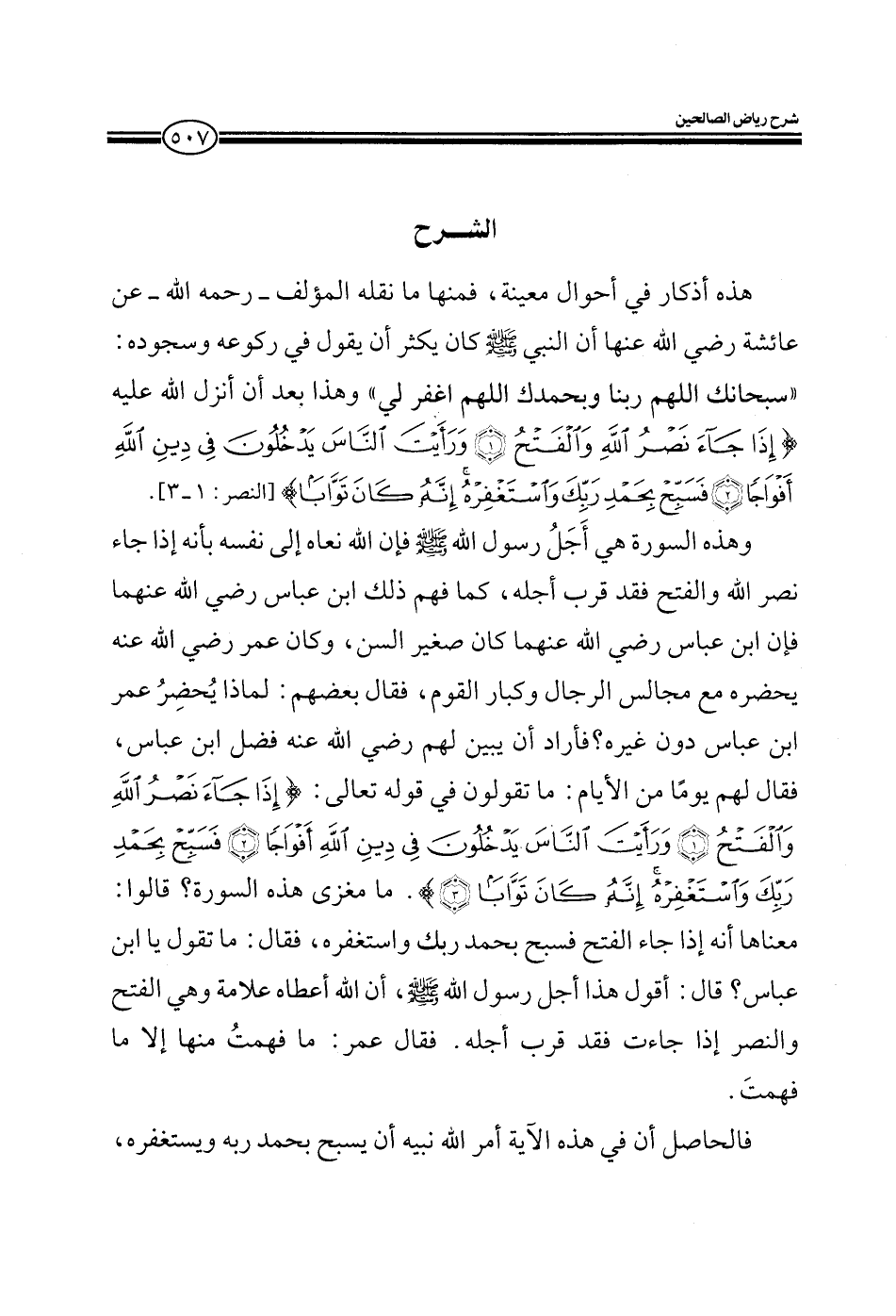 EXهذه أذكار في أحوال معينة فمنها ما نقله المؤلف رحمه الله عن عائشة رضي الله عنها أن النبي صلى الله عليه وسلم كان يكثر أن يقول في ركوعه وسجوده سبحانك اللهم ربنا وبحمدك اللهم اغفر لي وهذا بعد أن أنزل الله عليه إذا جاء نصر الله والفتح ورأيت الناس يدخلون في دين الله أفواجا فسبح بحمد ربك واستغفره إنه كان توبا وهذه السورة هي أجل رسول الله صلى الله عليه وسلم فإن الله نعاه إلى نفسه بأنه إذا جاء نصر الله وتم الفتح فقد قرب أجله كما فهم ذلك ابن عباس رضي الله عنهما فإن ابن عباس - رضي الله عنهما - كان صغير السن وكان عمر رضي الله عنه يحضره مع مجالس الرجال وكبار القوم فقال بعضهم لماذا يحضر عمر ابن عباس ويترك أبناءه فأراد أن يبين لهم رضي الله عنه فضل ابن عباس فقال لهم يوما من الأيام ما تقولون في قوله تعالى {إذا جاء نصر الله والفتح ورأيت الناس يدخلون في دين الله أفواجا فسبح بحمد ربك واستغفره إنه كان توبا} ما معنى هذه السورة قالوا معناها أنه إذا جاء الفتح فسبح بحمد ربك واستغفره فقال ما تقول يا ابن عباس قال أقول هذا أجل رسول الله صلى الله عليه وسلم أن الله أعطاه علامة وهي الفتح والنصر إذا جاءت فقد قرب أجله فقال ما فهمت منها إلا ما فهمت فالحاصل أن هذه الآية أمر الله نبيه أن يسبح بحمد ربه ويستغفره