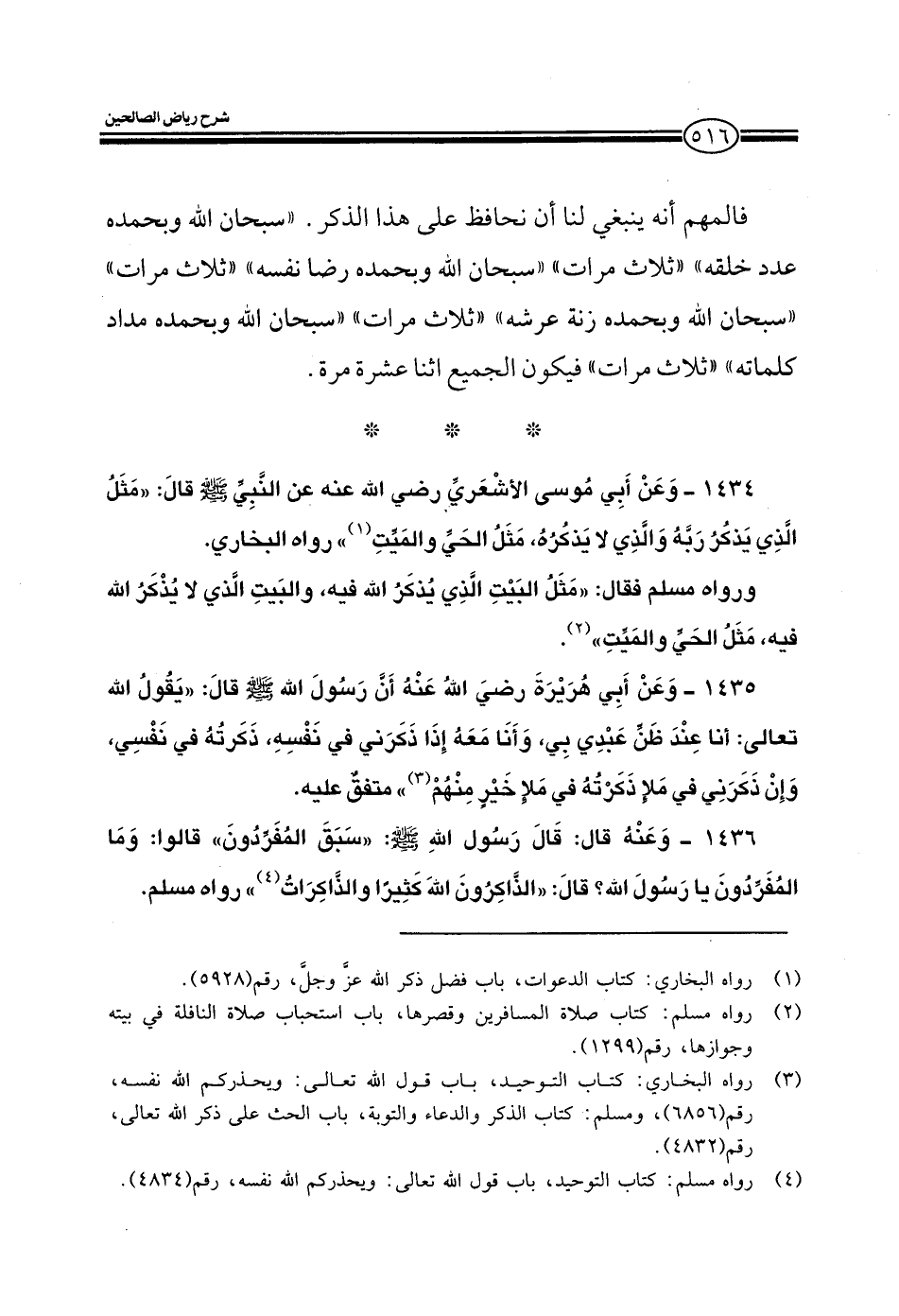 1434 - وعن أبي موسى الأشعري رضي الله عنه عن النبي صلى الله عليه وسلم قال مثل الذي يذكر ربه والذي لا يذكره مثل الحي والميت رواه البخاري.