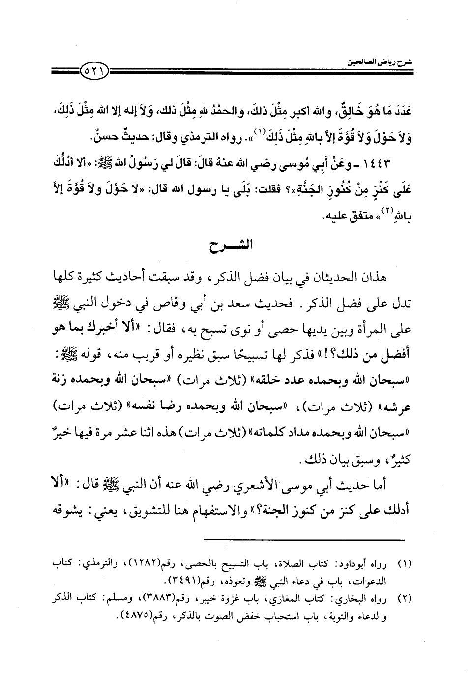 1443 - وعن أبي موسى رضي الله عنه قال قال لي رسول الله صلى الله عليه وسلم ألا أدلك على كنز من كنوز الجنة فقلت بلى يا رسول الله قال لا حول ولا قوة إلا بالله متفق عليه.