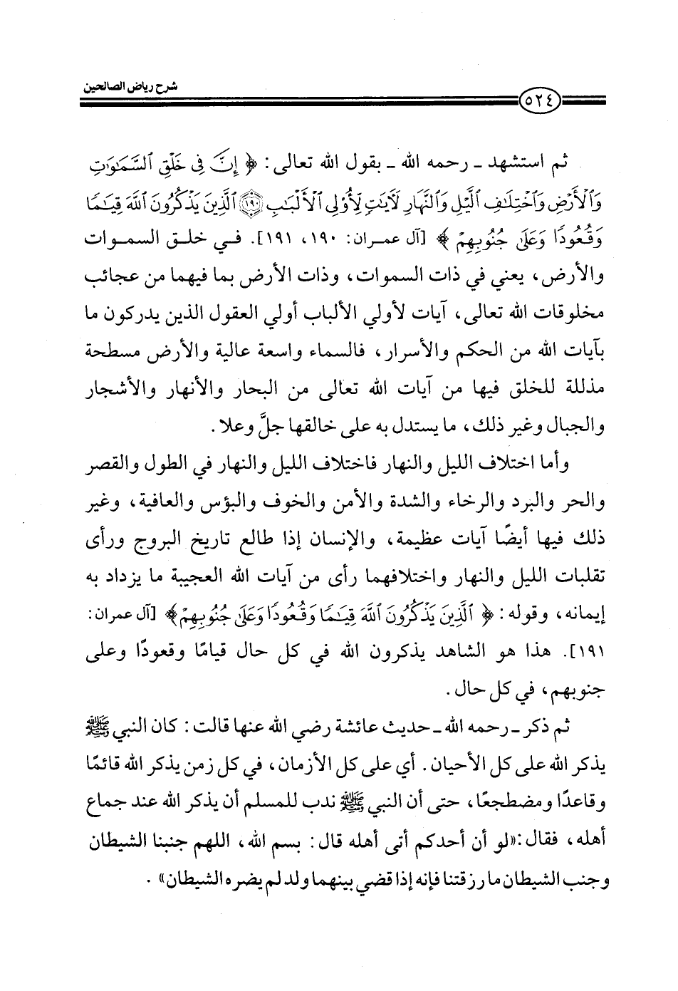 وكذلك ذكر رحمه الله حديث عائشة رضي الله عنها قالت كان النبي صلى الله عليه وسلم يذكر الله على كل الأحيان أي على كل الأزمان في كل زمن يذكر الله قائما وقاعدا ومضطجا حتى أن النبي صلى الله عليه وسلم ندب الإنسان أن يذكر الله عند جماع أهله فقال لو أن أحدكم أتى أهله قال بسم الله اللهم جنبنا الشيطان وجنب الشيطان ما رزقتنا فإنه إذا قضى بينهما ولد لم يضره الشيطان
