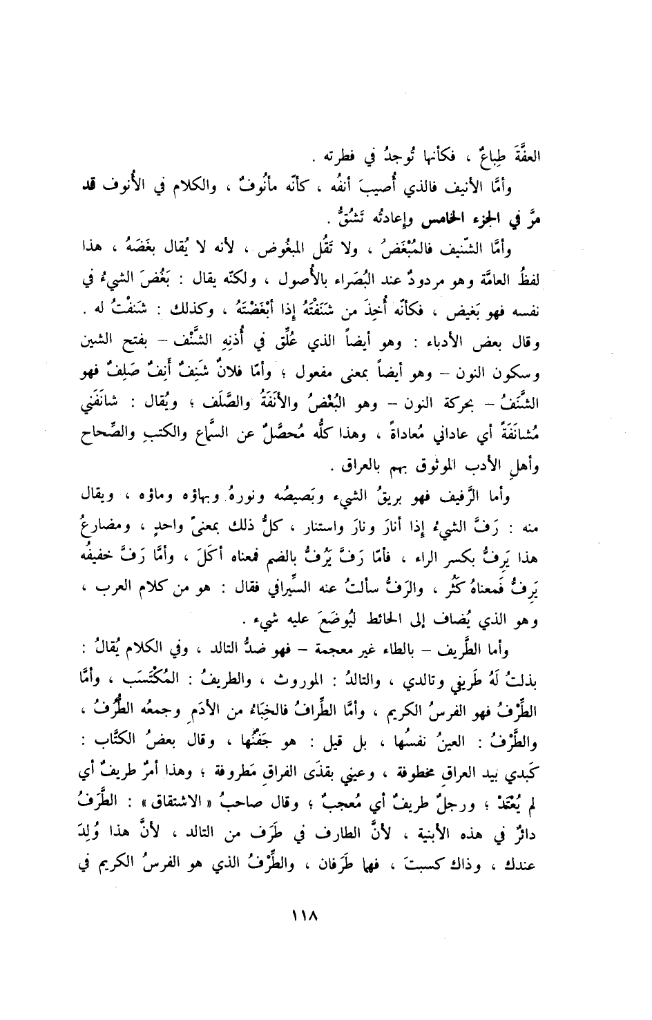 وأما الشنيف فالمبغض، ولا تقل المبغوض، لأنه لا يقال بغضه، هذا لفظ العامة وهو مرود عند البصراء بالأصول، ولكنه يقال: بغض الشيء في نفسه فهو بغيض، فكأنه أخذ من شنفته إذا أبغضته، وكذلك: شنفت له. وقال بعض الأدباء: وهو أيضاً الذي علق في أذنه الشنف - بفتح الشين وسكون النون - وهو أيضاً بمعنى مفعول؛ وأما فلان شنف أنف صلف فهو الشنف - بحركة النون - وهو البغض والأنفة والصلف؛ ويقال: شانفني مشانفة أي عاداني معاداة، وهذا كله محصل عن السماع والكتب والصحاح وأهل الأدب الموثوق بهم بالعراق.