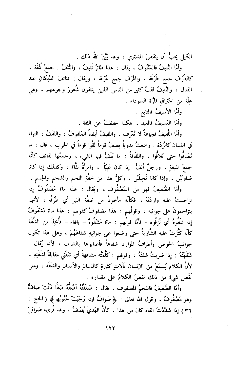 وأما الضفيف فهو من المضفوف، ويقال: هذا ماء مضفوف إذا تزاحمت عليه وأردته، فكأنه مأخوذ من ضفة النهر أي طرفه، لأنهم يتزاحمون على جوانبه، وقولهم: هذا مضفوف كقولهم: هذا ماء مشفوف إذا شفوه أي نزفوه؛ فأما قولهم: ماء مشفوه - بالهاء - فأخذ من الشفة كأنه كثرت عليه الاربة حتى وضعوا على جوانبه شفاههم، وعلى هذا تكون جوانب الحوض وأطراف الموارد شفاهاً فأصابوها بالشرب، لأنه يقال: شفهته: إذا ضربت شفته، وقولهم: كلمته مشافهة أي شفتي مقابلة لشفته، لأن الكلام يسمع من الإنسان بآلات كثيرة كاللسان والأسنان والشفة، ومتى نقص شيء من ذلك نقص الكلام على مقداره.