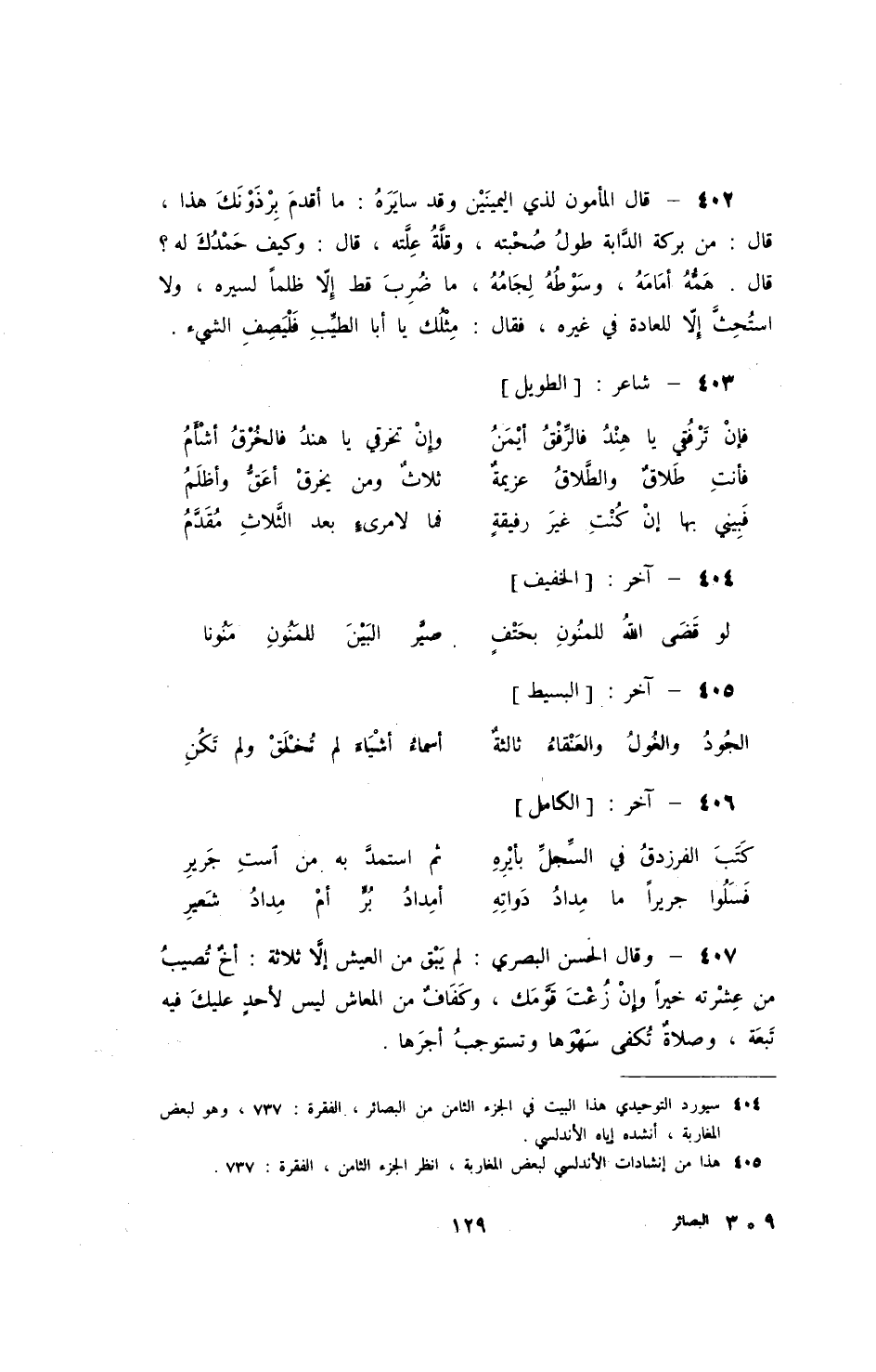 قال المأمون لذي اليمينين وقد سايره: ما أقدم برذونك هذا، قال: من بركة الدابة صحبته، وقلة علته، قال: وكيف حمدك له؟ قال: همه أمامه، وسوطه لجامه، ما ضرب قط إلا ظلماً لسيره، ولا استحث إلا للعادة في غيره، فقال: مثلك يا أبا الطيب فليصف الشيء.