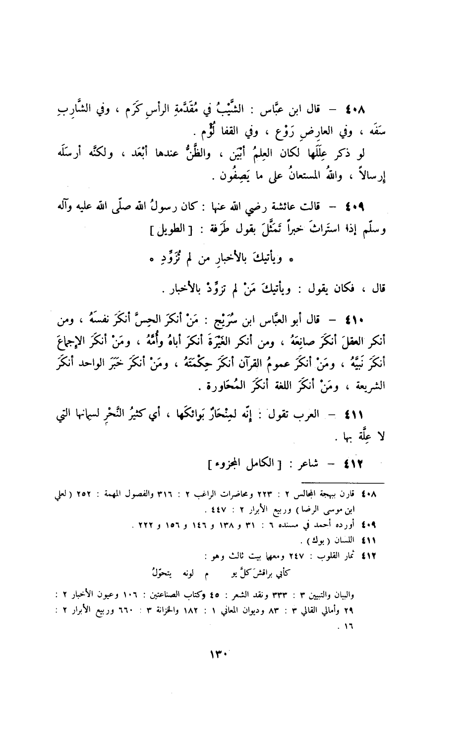 قال ابن عباس: الشيب في مقدمة الرأس كرم، وفي الشارب سفه، وفي العارض روع، وفي القفا لؤم.