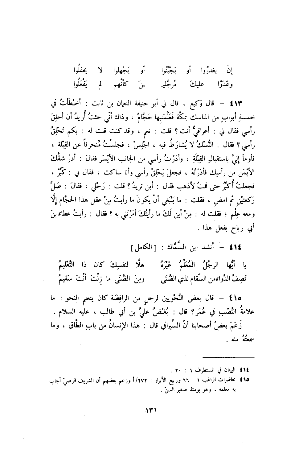 قال وكيع، قال لي أبو حنيفة النعمان بن ثابت: أخطأت في خمسة أبواب من المناسك بمكة فعلمنيها حجام، وذاك أني جئت أريد أن أحلق رأسي فقال لي: أعراقي أنت؟ قلت: نعم، وقد كنت قلت له: بكم تحلق رأسي؟ فقال: النسك لا يشارط فيه، اجلس، فجلست منحرفاً عن القبلة، فأومأ إلي باستقبال القبلة، وأدرت رأسي من الجانب الأيسر فقال: أدر شقك الأمين من رأسك فأدرته، فجعل يحلق رأسي وأنا ساكت، فقال لي: كبر، فجعلت أكبر حتى قمت لأذهب فقال: أين تريد؟ قلت: رحلي، فقال: صل ركعتين ثم امض، فقلت: ما ينبغي أن يكون ما رأيت من عقل هذا الحجام إلا ومعه علم؛ فقلت له: من أين لك ما رأيتك أمرتني به؟ فقال: رأيت عطاء بن أبي رباح بفعل هذا.