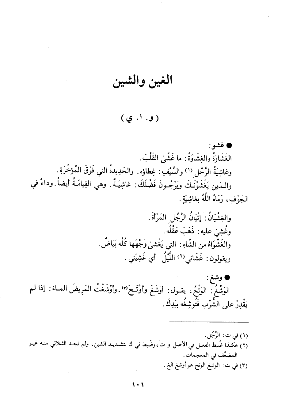 غشو الغَشَاوَة والغِشَاوَة : ما غَشّى القَلْبَ . وغاشِيَةُ الرَّحْل والسَّيْفِ : غِطاؤه . والحَدِيدةُ التي فَوْقَ المُؤخّرَةِ . والذين يَغْشَوْنَكَ ويَرْجُونَ فَضْلَكَ : غاشِيَةٌ . وهي القِيامَةُ أيضاً . وداءٌ في الجَوْفِ ، رَمَاهُ اللَّهُ بغاشِيَةٍ . والغِشْيَانُ : إتْيَانُ الرَّجُلَ المَرْأةَ . وغُشِيَ عليه : ذَهَبَ عَقْلُه . والغَشْوَاءُ من الشّاءِ : التي يَغْشى وَجْهَها كُلَّه بَيَاضٌ . ويقولون : غَشَاني اللَّيْلُ : أي غَشِيَني . وشغ الوشغ : الوتح ، يقول : أوشغ وأوتح . وأوشغت المريض الماء : إذا لم يقدر على الشرب فتوشغه بيدك .