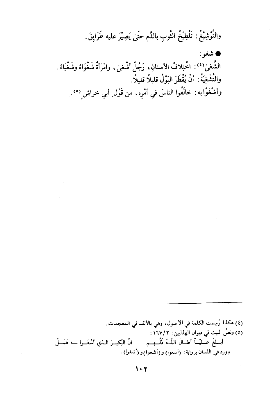 والتَّوْشِيْغُ : تَلْطِيْخُ الثَّوبِ بالدَّم حتّى يَصِيْرَ عليه طَرَايِقَ . شغو الشَّغى : اخْتِلافُ الأسنانِ ، رَجُلٌ أشْغى ، وامْرَأةٌ شَغْوَاءُ وشَغْيَاءُ . والتَّشْغِيَةُ : أنْ يقْطَرَ البَوْلُ قليلاً قليلاً . وأشْغَوْا به : خالَفُوا الناسَ في أمْرِه ، من قَوْل أبي خراشٍ .
