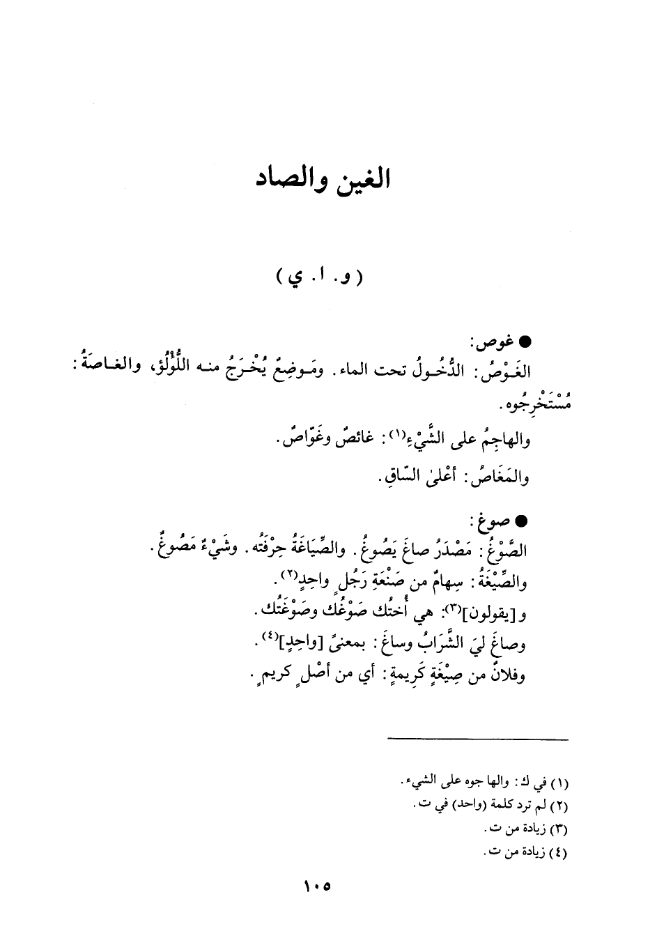 غوص الغَوْصُ : الدُّخُولُ تحت الماء . ومَوضِعٌ يُخْرَجُ منه اللُّؤْلُؤ ، والغاصَةُ : مُسْتَخْرِجُوه . والهاجِمُ على الشّيْءِ : غائصٌ وغَوّاصٌ . والمَغَاصُ : أعْلى السّاقِ . صوغ الصَّوْغ : مَصدر صاغَ يَصُوغُ . والصِّيَاغَةُ حِرْفَتُه . وشَيْءٌ مَصُوغٌ . والصِّيْغَةُ : سِهامٌ من صَنْعَةِ رَجُلٍ واحِدٍ . ويقولون : هي أختُك صوْغُك وصَوْغَتُك . وصاغَ ليَ الشَّرَابُ وساغَ : بمعنىً واحِدٍ . وفلان من صيغة كريمة : أي من أصل كريم .