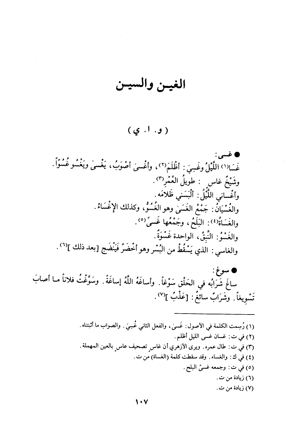 غسى غَسَا اللَّيْلُ وغَسِيَ : أظْلَمَ ، وأغْسى أصْوَبُ ، يَغسى ويَغسو غسُوّاً . وشَيْخٌ غاسٍ : طويلُ العُمْر . وأغْساني اللَّيْلُ : ألْبَسَني ظَلامَه . والغُسْيانُ : جَمْعُ الغَسَى وهو الغُسُوُّ ، وكذلك الإِغْسَاءُ . والغَسَاةُ : البَلَحُ ، وجَمْعُها غَسىً . والغَسْوُ : النَّبِقُ ، الواحدة غَسْوَةٌ . والغاسي : الذي يَسْقُطُ من البُسْر وهو أخْضَرُ فَيَنْضَج بعد ذلك . سوغ ساغَ شَرَابُه في الحَلْق سَوْغَاً . وأساغَهُ اللهُ إساغة . وسوغت فلاناً ما أصاب تَسْوِيغاً . وشَرَابٌ سائغٌ : عَذْبٌ .