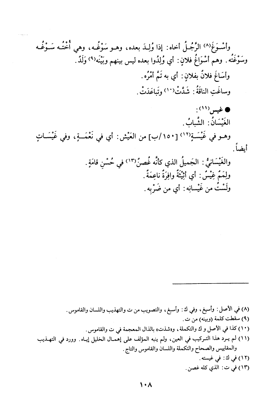 وأسْوَغَ الرجُلُ أخاه : إذا وُلِدَ بعده ، وهو سَوْغُه ، وهي أخْتُه سَوْغُه وسَوْغَتُه . وهم أسْوَاغُ فلانٍ : أي وُلدُوا بعده ليس بينهم وبَيْنَه وَلَدٌ . وأسَاغَ فلانٌ بفلانٍ : أي به تَمَّ أمْرُه . وساغَتِ الناقَةُ : شَدَّتْ وتَباعَدَتْ . غيس الغَيْسَانُ : الشَّبابُ . وهو في غَيْسَةٍ من العَيْش : أي في نَعْمَةٍ ، وفي غَيْسَاتٍ أيضاً . والغَيْسَانيُّ : الجَميلُ الذي كأنَّه غُصنٌ في حُسْنِ قامَةٍ . ولمَمٌ غِيْسٌ : أي أثِيْثَةٌ وافِرَةٌ ناعِمَةٌ . ولَسْتُ من غَيْسانِه : أي من ضَرْبِه .