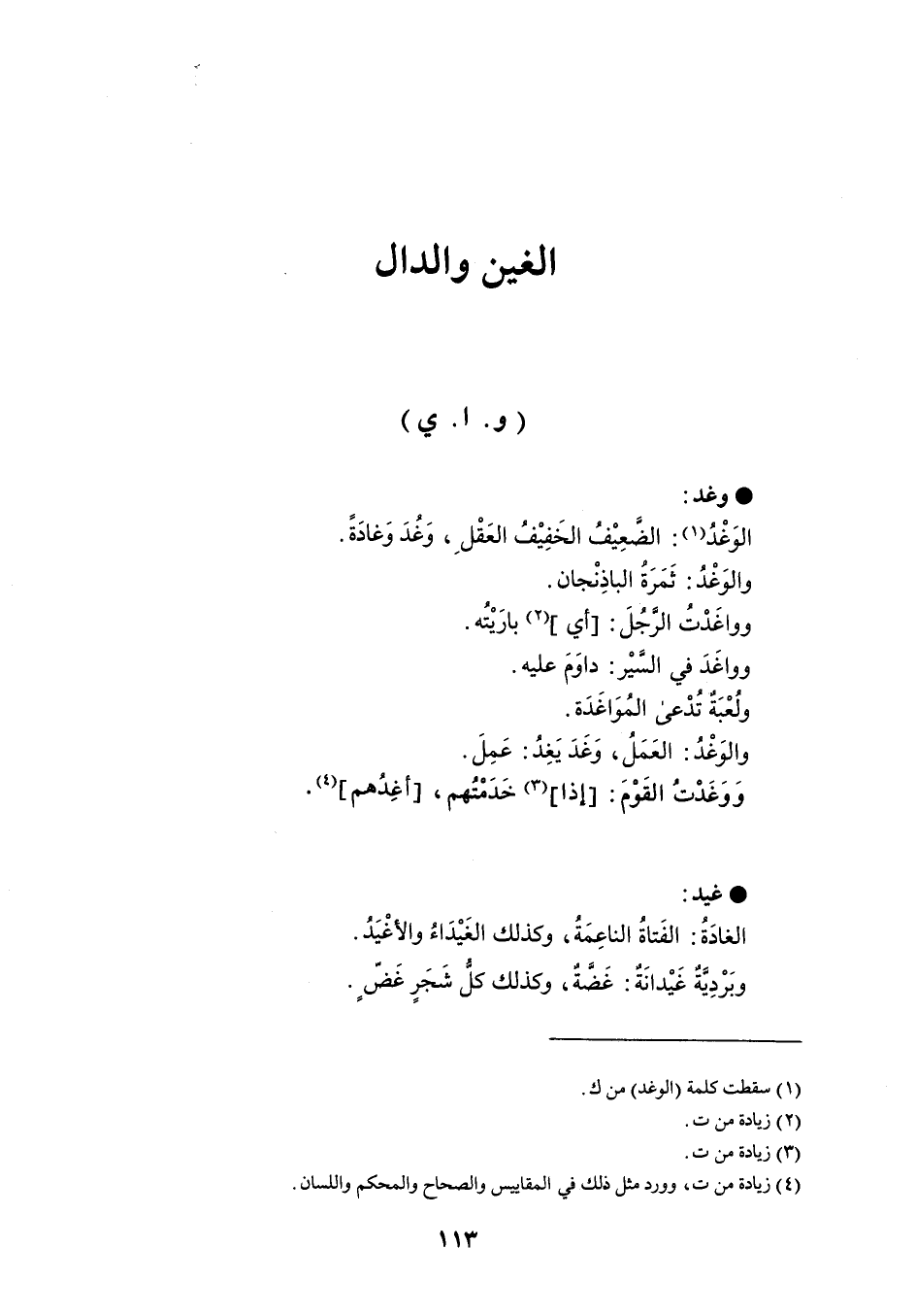 وغد الوَغْدُ : الضَّعِيْفُ الخَفِيْفُ العَقْل ، وَغُدَ وَغادَةً . والوَغْدُ : ثَمَرَة الباذِنْجان . وواغَدْتُ الرَّجُلَ : أي بارَيْتُه . وواغَدَ في السَّيْر : داوَمَ عليه . ولُعْبَةٌ تُدْعى المُوَاغَدة . والوَغْدُ : العَمَلُ ، وَغَدَ يَغِدُ : عَمِلَ . ووَغَدْتُ القَوْمَ : إذا خَدَمْتُهم ، أغِدُهم . كيد الغادَةُ : الفَتاةُ الناعِمَةُ ، وكذلك الغَيْدَاءً والأغْيَدُ . وبَرْدِيَّةٌ غَيْدانَةٌ : غَضَّةٌ ، وكذلك كلُّ شَجَرٍ غَضٍّ .