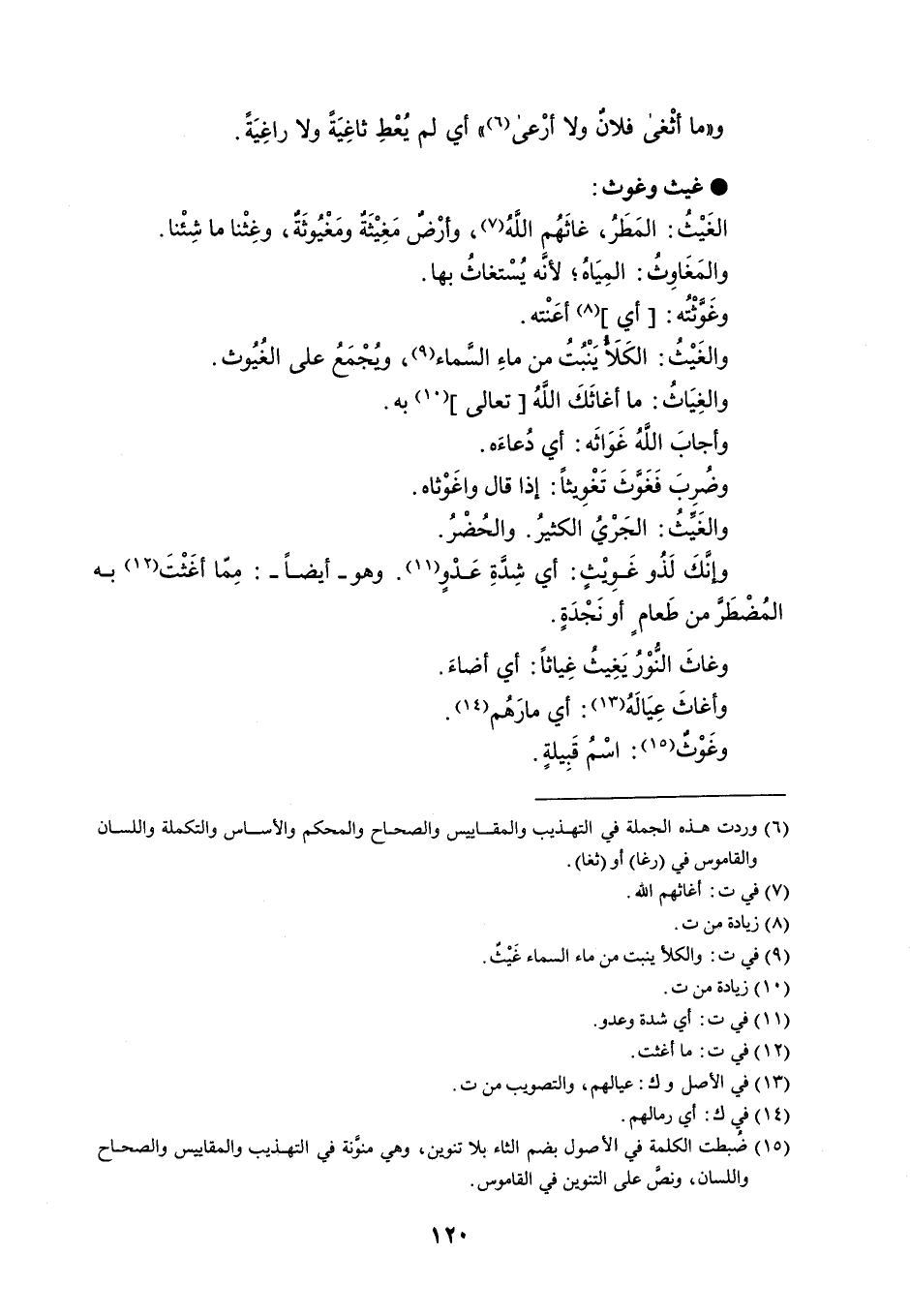 و ' ما أثْغى فلانٌ ولا أرْعى ' أي لم يُعْطِ ثاغِيَةً ولا راغِيَةً . غيث وغوث الغَيْثُ : المَطَرُ ، غاثهم اللَّهُ ، وأرْضٌ مَغِيْثَةٌ ومَغْيُوثَةٌ ، وغِثْنا ما شِئْنا . والمَغَاوِثُ : المِيَاهُ لأنَّه يسْتغاثُ بها . وغَوَّثْتُه : أي أعَنْته . والغَيْثُ : الكلأ يَنْبُتُ من ماءِ السَّماء ، ويُجْمَعُ على الغُيُوث . والغِيَاث : ما أغاثَكَ اللَّهُ تعالى به . وأجابَ اللَّهُ غَوَاثَه : أي دُعاءَه . وضُرِبَ فَغَوَّثَ تَغْوِيثاً : إذا قال واغَوْثاه . والغَيِّثُ : الجَرْيُ الكثيرُ . والحُضْرُ . وإنَّكَ لَذُو غَوِيْثٍ : أي شِدَّةِ عَدْوٍ . وهو - أيضاً - : مِمّا أغَثت به المُضْطَرَّ من طَعامٍ أو نَجْدَةٍ . وغاثَ النُّوْرُ يَغِيثُ غِياثاً : أي أضاءَ . وأغاثَ عِيَالَه : أي مارَهُم . وغَوْثٌ : اسْمُ قَبِيلةٍ .