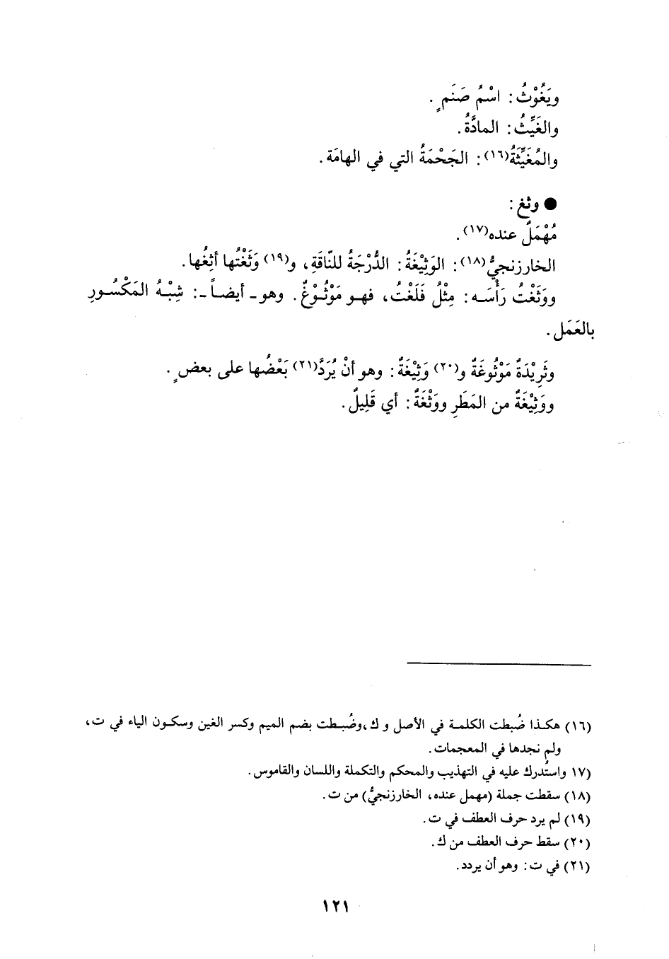 ويَغُوْثُ : اسْمُ صَنَمٍ . والغَيِّثُ : المادَّةُ . والمُغَيِّثَةُ : الجَحْمَةُ التي في الهامَة . وثغ مُهْمَل عنده . الخارزنجيُّ : الوَثيْغَةُ : الدُّرْجَةُ للنّاقَةِ ، ووَثَغْتُها أثِغُها . ووَثَغْتُ رَأْسَه : مِثْلُ فَلَغْتُ ، فهو مَوثوْغٌ . وهو - أيضاً - : شِبْهُ المَكْسُورِ بالعَمَل . وثَرِيْدَةٌ مَوْثُوغَةٌ ووثيْغَةٌ : وهو أنْ يُرَدَّ بَعْضُها على بعضٍ . ووَثيْغَةٌ من المَطَرِ ووَثْغَةٌ : أي قَلِيلٌ .