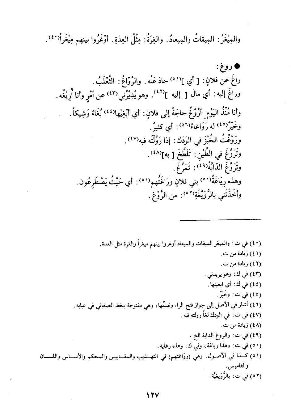 والمِيْغَرُ : المِيقاتُ والمِيعادُ . والغِرَةُ : مِثْلُ العِدَةِ . أوْغَرُوا بينهم مِيْغَراً . روغ راغَ عن فلانٍ : أي حادَ عَنْه . والروّاغُ : الثَّعْلَبُ . وراغَ إليه : أي مالَ إليه . وهو يُدِيْرني عن أمْرٍ وأنا أرِيْغُه . وأنا مُنْذُ اليَوْم أرُوْغُ حاجَةً إلى فلانٍ : أي أبْغِيْها بُغَاءً وَشِيكاً . وخَيْرٌ له رَوَاغاءُ : أي كثيرٌ . ورَوَّغْتُ الخُبْزَ في الوَدَك : إذا رَوَّلْتَه فيه . وتَرَوَّغَ في الطِّيْنِ : تَلَطَّخِ به . وتَرَوَّغَ الدّابَّةُ : تَمَرَّغ . وهذه رِيَاغَةُ بني فلانٍ ورَاغَتُهم : أي حَيْثُ يَصْطَرِعُون . وأخَذْتَني بالرُّوَيْغَةِ : من الرَّوْغ .