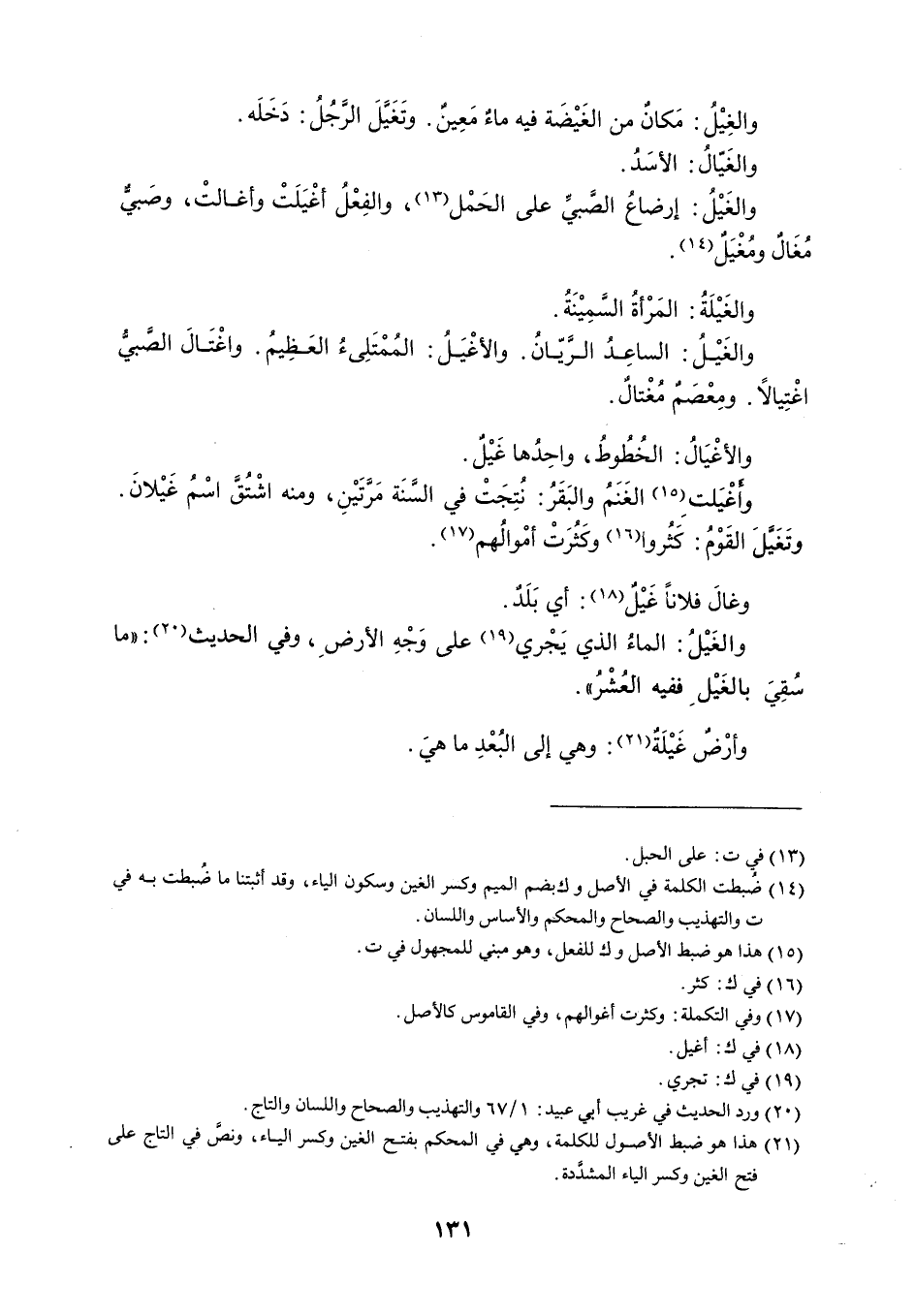 والغِيْلُ : مَكانٌ من الغَيْضَة فيه ماءٌ مَعِينٌ . وتَغَيَّلَ الرَّجُلُ : دَخَلَه . والغَيّالُ : الأسَدُ . والغَيْلُ : إرضاعُ الصَّبيِّ على الحَمْل ، والفِعْلُ أغْيَلَتْ وأغالتْ ، وصَبيٌّ مُغَالٌ ومُغْيَلٌ . والغَيْلَة : المَرْأةُ السَّمِيْنَةُ . والغَيْلُ : الساعِدُ الرَّيّانُ . والأغْيَلُ : المُمْتَلِىءُ العَظِيمُ . واغْتَالَ الصبيُّ اغْتِيالاً . ومِعْصَمٌ مُغْتالٌ . والأغْيَالُ : الخُطُوطُ ، واحِدُها غَيْلٌ . وأغْيَلت الغَنَمُ والبَقَرُ : نُتِجَتْ في السَّنَة مَرَّتَيْنِ ، ومنه اشْتُقَّ اسْمُ غَيْلانَ . وتَغَيَّلَ القَوْمُ : كَثُروا وكَثُرَتْ أمْوالهم . وغالَ فلاناً غَيْلٌ : أي بَلَدٌ . والغَيْلُ : الماءُ الذي يَجْري على وَجْهِ الأرض ، وفي الحديث : ' ما سُقِيَ بالغَيْل ففيه العُشْرُ ' . وأرْض غَيْلَةٌ : وهي إلى البُعْدِ ما هيَ .