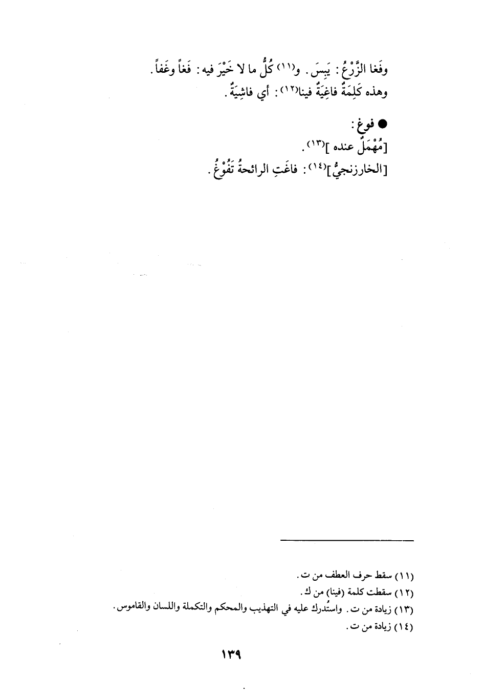 وفَغا الزَّرْعُ : يَبِسَ . وكلُّ ما لا خَيْرَ فيه : فَغاً وغَفاً . وهذه كَلِمَةٌ فاغِيَة فينا : أي فاشِيَة . فوغ مُهْمَل عنده . الخارزنجيُّ : فاغَتِ الرائحةُ تَفُوْغُ .