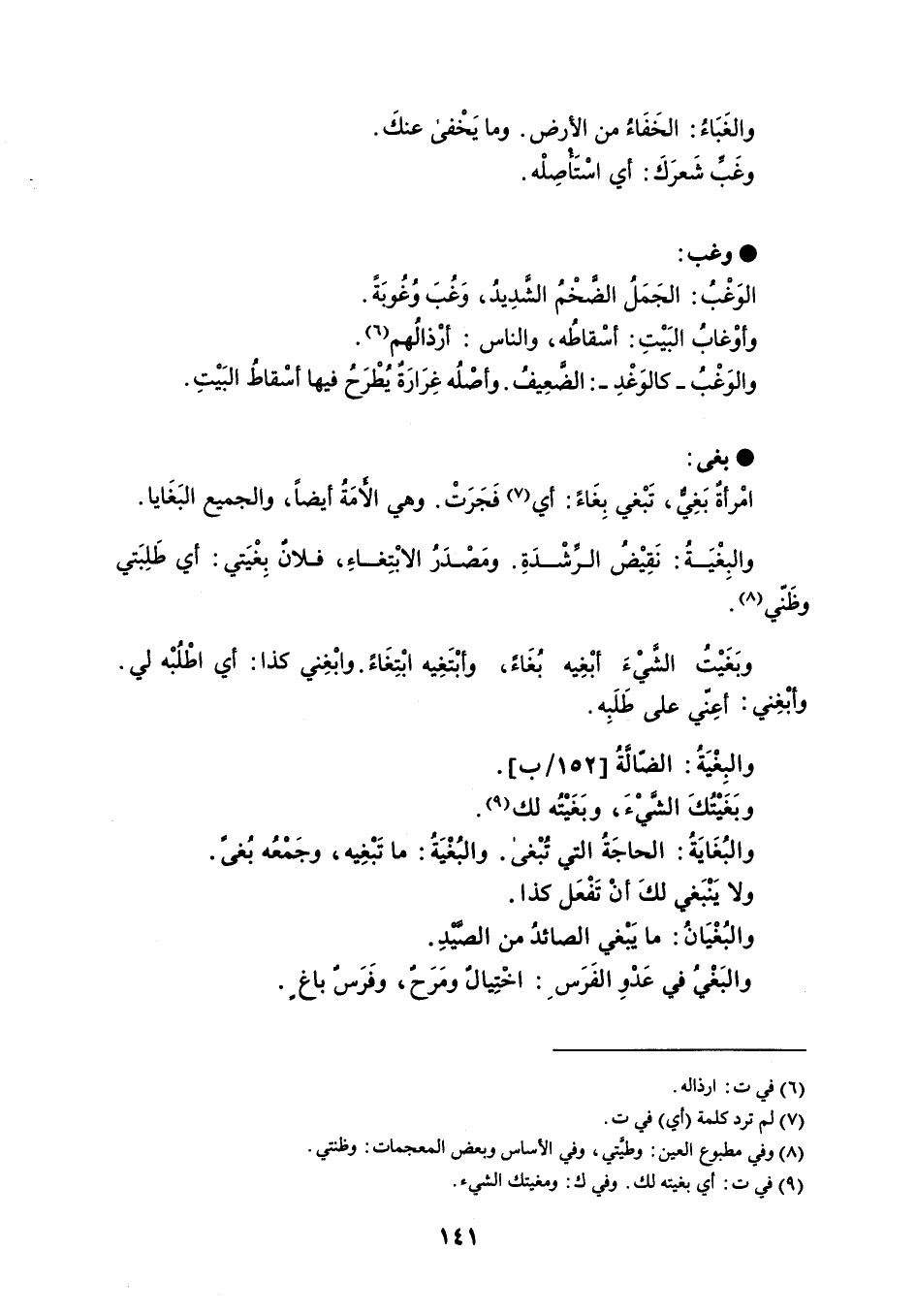 والغَبَاءُ : الخَفَاءُ من الأرض . وما يَخْفى عنكَ . وغَبِّ شَعرَكَ : أي اسْتَأصِلْه . وغب الوَغْبُ : الجَمَلُ الضَّخْمُ الشَّدِيدُ ، وَغُبَ وُغُوبَةً . وأوْغابُ البَيْتِ : أسْقاطُه ، والناس : أرْذالُهم . والوَغْبُ - كالوَغْدِ - : الضَّعِيفُ . وأصْلُه غِرَارَةٌ يُطْرَحُ فيها أسْقاطُ البَيْتِ . بغى امْرأةٌ بَغِيٌّ ، تَبْغي بِغَاءً : أي فَجَرَتْ . وهي الأمَةُ أيضاً ، والجميع البَغَايا . والبِغْيَةُ : نَقِيْضُ الرِّشْدَةِ . ومَصْدرُ الابْتِغاءِ ، فلانٌ بغْيَتي : أي طَلِبَتي وظَنّي . وبَغَيْتُ الشَيْءَ أبْغِيه بُغَاءً ، وأبْتَغِيه ابْتِغَاءً . وابْغِني كذا : أي اطْلُبْه لي . وأبْغِني : أعِّني على طَلَبِه . والبِغْيَةُ : الضّالَةُ . وبَغَيْتُكَ الشَيْءَ ، وبَغَيْتُه لك . والبُغَايَةُ : الحاجَةُ التي تُبْغى . والبُغْيَةُ : ما تَبْغِيه ، وجَمْعُه بُغىً . ولا يَنْبَغي لكَ أنْ تَفْعَل كذا . والبُغْيَانُ : ما يَبْغي الصائدُ من الصَيْدِ . والبَغْيُ في عَدْوِ الفَرَس : اخْتِيالٌ ومَرَحٌ ، وفَرَسٌ باغ .