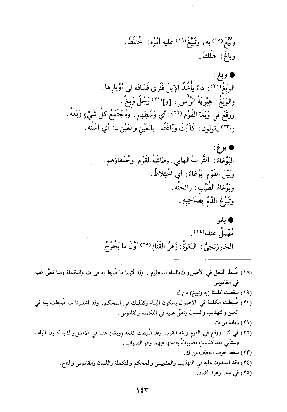 وُبيغَ به ، وتَبَيغَ عليه أمْرُه : اخْتَلَطَ . وباغ : هَلَكَ . وبغ الوَبَغُ : داءٌ يأْخُذُ الإبلَ فَتَرى فَسَادَه في أوْبارِها . والوَبَغُ : هِبْرِيَةُ الرأسَ ، ورَجُلٌ وَبِغ . ووَقَعَ في وَبَغَةِ القَوْم : أي وَسَطِهم . ومجْتَمَعُ كلِّ شَيْءٍ وَبَغَةٌ . ويقولون : كَذَبَتْ وَبّاغَتُه - بالغَيْنِ والعَيْن - : أي اسْتُه . بوغ البَوْغاءُ : الترابُ الهابي . وطاشَةُ القَوْم وحُمَقاؤهم . وبَيْنَ القَوْم بَوْغاءُ : أي اخْتِلاطٌ . وبَوْغاءُ الطِّيبِ : رائحَتُه . وتَبَوَّغَ الدَّمُ بِصَاحِبِهِ . بغو مُهْمَلٌ عنده . الخارزنجي : البغوةُ : زهر القَتَاد أولَ ما يَخْرُجُ .