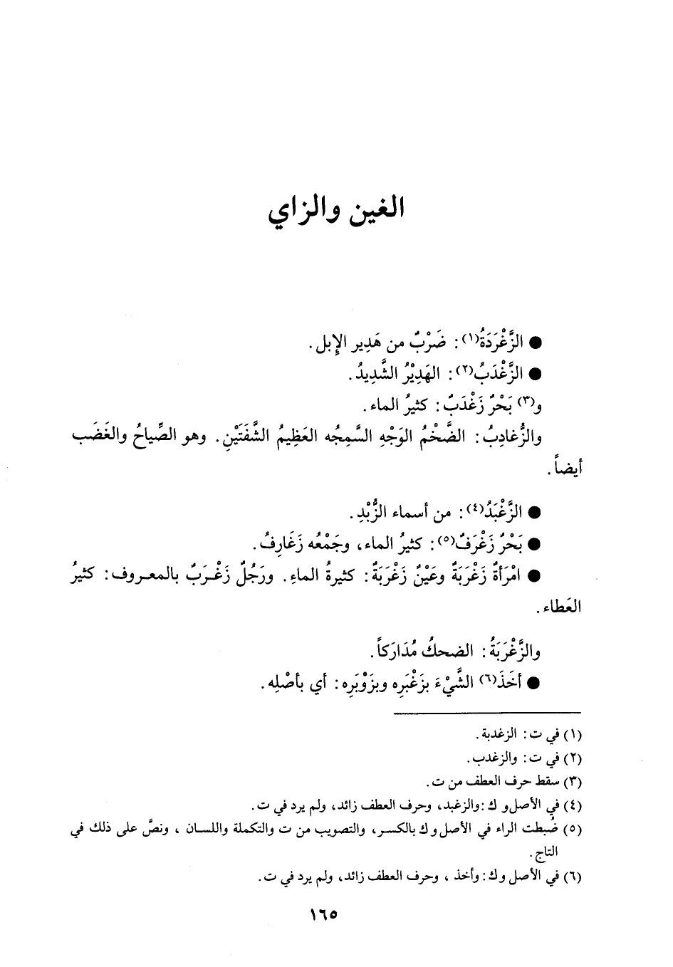 الزَّغْرَدَةُ ضَرب من هَدِير الإبل . الزِّغْدَبُ الهَدِيْرُ الشَدِيد . وبَحْرٌ زَغْدَب كثيرُ الماء . والزُّغادِبُ : الضَّخْمُ الوَجْهِ السمِجُه العَظِيمُ الشَّفَتَيْنِ . وهو الصِّياحُ والغَضَب أيضاً . الزَّغْبَدُ من أسماء الزُّبْدِ . بَحْرٌ زَغْرَفٌ كثيرُ الماء ، وجَمْعُه زَغَارِفُ . امْرَأةٌ زَغْرَبَةٌ وعَيْنٌ زَغْرَبَةٌ كثيرةُ الماءِ . ورَجُلٌ زَغْرَبٌ بالمعروف كثيرُ العَطاء . والزَّغْرَبَةُ : الضحكُ مُدَارَكاً . أخَذَ الشَّيْءَ بزَغْبَرِه وبزَوْبَرِه أي بأصْلِه .
