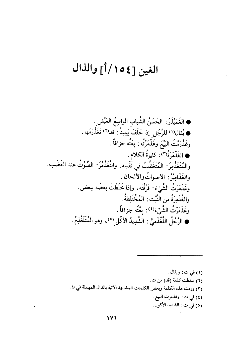 الغَمَيْذر الحَسَنُ الشَّبابِ الواسِعُ العَيْش . يُقال للرَّجُل إذا حَلَفَ يَمِيناً قد تَغَذرَمَها . وغَذْرَمْتُ البَيْعَ وغَذْمَرْتُه بِعْتُه جزافاً . الغَذْمَرَةُ كثيرةُ الكلامِ . والمُتَغَذْمِرُ المُتَغَضِّبُ في نفْسِه . والتَّغَذْمُرً الصَّوْتُ عند الغَضَب . والغَذَامِيْرُ الأصواتُ والألحان . وغَذْمَرْتُ الشَّيْءَ فَرَّقْتَه ، وإذا خَلَطْتَ بعضَه ببعض . والغُذَمِرَةُ من النَّبْت المُخْتَلِطةُ . وغَذْمَرْتُ الشَّيْءَ بِعْتُه جزافاً . الرَّجُلُ اللِّغْذَميُّ الشَّدِيدُ الأكْل ، وهو المُتَلَغْذِمُ .