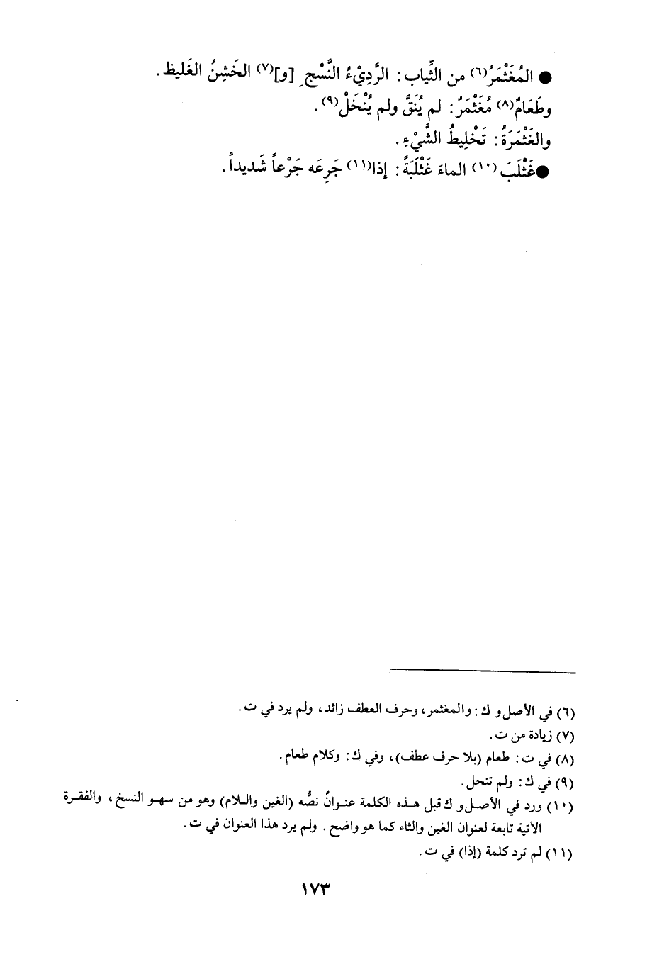 المُغَثْمَرُ من الثِّياب الرَّدِيْءُ النَّسْج و الخَشِنُ الغَليظ . وطَعَامٌ مُغَثْمَرٌ لم يُنَق ولم يُنْخَلْ . والغَثْمَرَةُ تَخْلِيطُ الشَّيْءِ . غَثْلَبَ الماءَ غَثْلَبَةً إذا جَرِعَه جَرْعاً شَديداً .