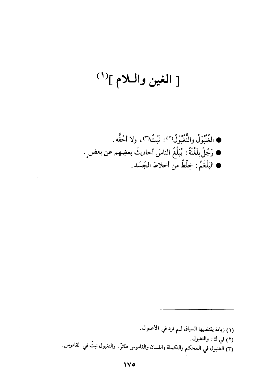 الغُنْبُوْلُ والنُّغْبُوْلُ نَبْتٌ ، ولا أحُقُّه . رَجُلٌ بِلَغْنَةٌ يُبَلِّغُ الناسَ أحاديثَ بعضِهم عن بعضٍ . البَلْغَمُ خِلْطٌ من أخلاط الجَسَد .