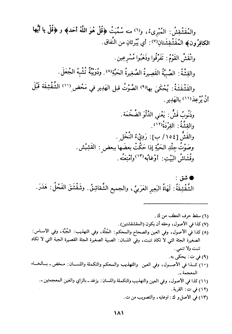 والمُقَشْقِشُ : المُبْرِىءُ ، ومنه سُمِّيَتْ ' قُلْ هوَ اللَّهُ أحَد ' و ' قُلْ يا أيُّها الكافِرُون ' المُقَشْقِشَتانِ : أي يُبْرئانِ من النِّفاق . وانْقَشَّ القَوْمُ : تَفَرَّقُوا وذَهَبُوا مُسْرِعِين . والقِشَةُ : الصَّبِيَّةُ القَصِيرُة الصَّغِيرةُ الحَبةِ . ودويبةٌ تُشْبِهُ الجُعَلَ . والقَشْقَشَةُ : يُحْكَى بها الصَّوْتُ قبل الهَدِير في مَحْض الشِّقْشِقَة قَبْلَ أنْ يُرْعِدَ بالهَدِير . وذَنُوبٌ قَشٌّ : يَعْني الدَّلْوَ الضَّخْمَة . والقِشَّة : القِرْدَةُ . والقَشُّ : رَديْءُ النَّخْل . وصَوْت جِلْدِ الحَيةِ إذا حَكَّتْ بعضَها ببعضٍ : القَشِيْش . وقُشَاشُ البَيْتِ : أوْغابُه وأمْتِعَتُه . شق الشِّقْشِقَةُ : لَهَاةُ البَعِيرِ العَرَبيِّ ، والجميع الشَّقاشِقُ . وشَقْشَقَ الفَحْلُ : هَدَرَ .