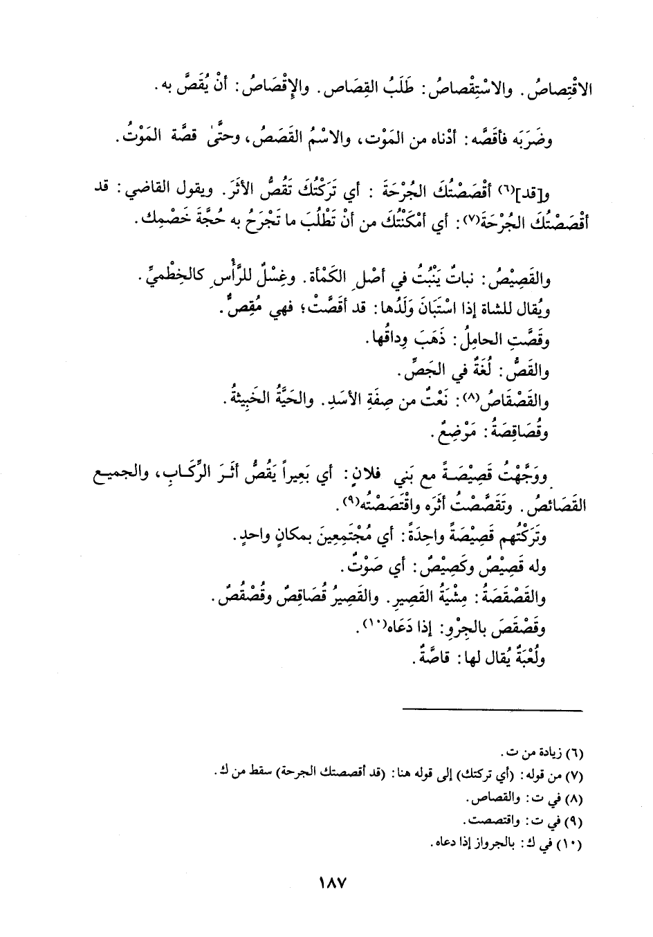 الاقْتِصاصُ . والاسْتِقْصاصُ : طَلَبُ القِصَاص . والإقْصَاصُ : أنْ يُقَصَّ به . وضَرَبَه فأقَصَه : أدْناه من المَوْت ، والاسْمُ القَصص ، وحتَى قَصّة المَوْتُ . وقد أقْصَصْتُكَ الجُرْحَةَ : أي تَرَكْتُكَ تَقُصُّ الأثَرَ . ويقول القاضي : قد أقْصَصْتُكَ الجُرْحَةَ : أي أمْكَنْتُكَ من أنْ تَطْلُبَ ما تَجْرَحُ به حُجَّةَ خَصمِك . والقَصِيْصُ : نبات يَنْبُتُ في أصْل الكَمْأة . وغِسْلٌ للرأس كالخِطْميِّ . ويُقال للشاة إذا اسْتَبَانَ وَلَدُها : قد أقصَّتْ فهي مُقِص . وقَصَّتِ الحامِلُ : ذَهَبَ وِداقُها . والقَصُّ : لُغَةٌ في الجَصِّ . والقَصْقَاصُ : نَعْتٌ من صِفَةِ الأسَدِ . والحَيةُ الخَبِيثةُ . وقُصَاقِصَةُ : مَوْضِعٌ . ووَجَّهْتُ قَصِيْصَةً مع بَني فلان : أي بَعِيراً يَقُصُ أثَرَ الركَابِ ، والجميع القَصَائصُ . وتَقَصَّصْتُ أثَرَه واقْتَصَصْتُه . وتَرَكْتُهم قَصِيْصَةً واحِدَةً : أي مُجْتَمِعِينَ بمكانٍ واحدٍ . وله قَصِيْصٌ وكَصِيْص : أي صَوْتٌ . والقَصْقَصَةُ : مِشْيَةُ القَصِيرِ . والقَصِيرُ قُصَاقِصٌ وقُصْقُصٌ . وقَصْقَصَ بالجِرْوِ : إذا دَعَاه . ولُعْبَة يُقال لها : قاصَة .