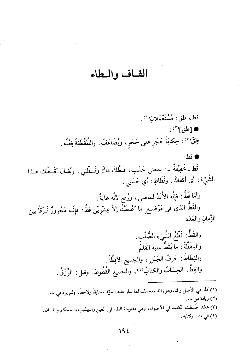 قط ، طق : مُسْتَعْمَلانِ . طق طِقْ : حِكايَةُ حَجَرٍ على حَجَرٍ ، ويُضَاعَفُ . والطِّقْطَقَةُ فِعْلُه . قط قَطْ - خَفِيْفَةٌ - : بمعنى حَسْب ، قَطْكَ ذاكَ وقَطْني . وُيقال أقَطَّك هذا الشَّيْءُ : أي أكَفَاكَ . وقَطَاطِ : أي حَسْبي . وأمّا قَطُّ : فإِنَّه الأَبَدُ الماضي ، ورُفِعَ لأنَّه غايَةٌ . والقَطُّ الذي في مَوْضع ما أعْطَيْتُه إلاّ عِشْرِيْنَ قَطِّ : فإِنَّه مَجْرورٌ فَرْقاً بين الزَّمانِ والعَدَد . والقَطُّ : قَطْعُ الشَّيْءِ الصُّلْبِ . والمِقَطًةُ : ما يُقَطُّ عليه القَلَمُ . والقِطَاطُ : حَرْفُ الجَبَل ، والجميع الأقِطَةُ . والقِطًّ : الحِسَابُ والكِتابُ ، والجميع القُطُوط . وقيل : الرِّزْقُ .