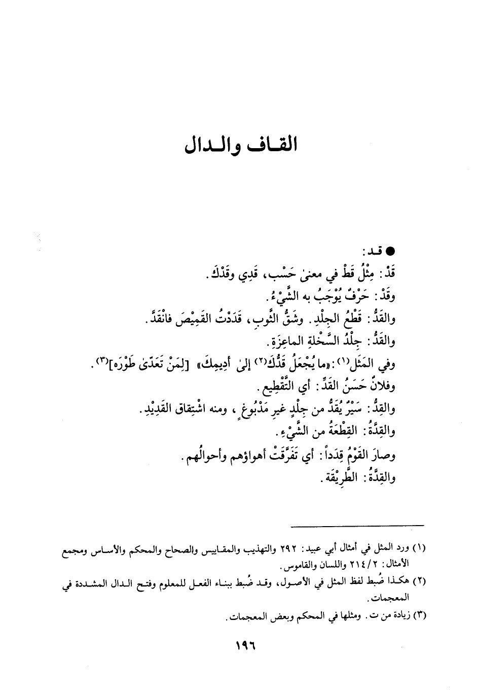 ؟ قد قَدْ : مِثْلُ قَطْ في معنى حَسْب ، قَدِي وقَدْكَ . وقَدْ : حَرْفٌ يُوْجَبُ به الشَّيْءُ . والقَدُّ : قَطْعُ الجِلْدِ . وشَقُّ الثَّوبِ ، قَدَدْتُ القَمِيْصَ فانْقَدَّ . والقَدُّ : جِلْدُ السَّخْلةِ الماعِزَةِ . وفي المَثَل : ' ما يُجْعَلُ قَدُكَ إلى أدِيمِكَ ' لِمَنْ تَعَدّى طَوْرَه . وفلانٌ حَسَنُ القَدَ : أي التَقْطِيع . والقِدُّ : سَيْرٌ يُقَدُّ من جِلْدٍ غيرِ مَدْبُوغٍ ، ومنه اشْتِقاق القَدِيْدِ . والقدَةُ : القِطْعَةُ من الشَيْءِ . وصارَ القَوْمُ قِدَداً : أي تَفَرَّقَتْ أهواؤهم وأحوالهم . والقِدَّةُ : الطَّرِيْقَة .