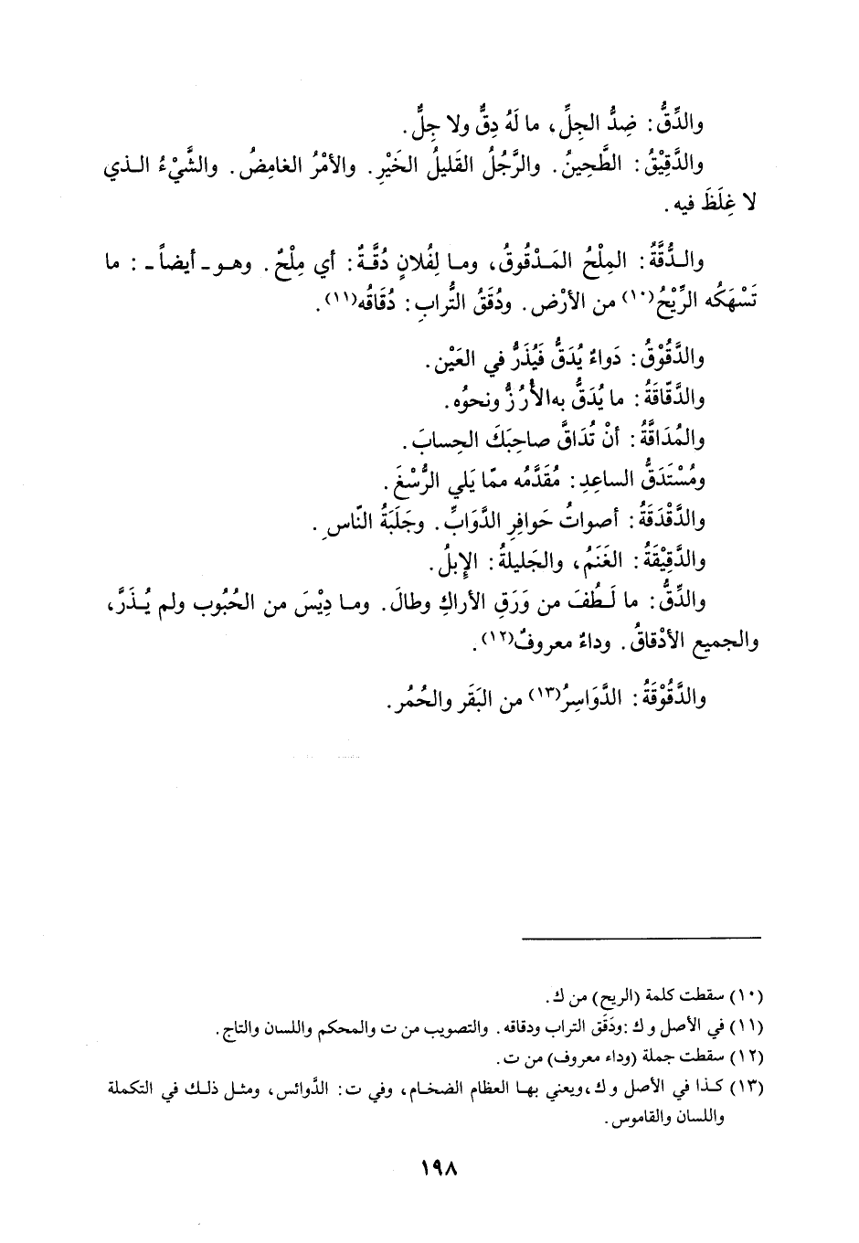 والدقًّ : ضِدُّ الجِلِّ ، ما لَهُ دقٌّ ولا جِلٌّ . والدَّقِيْقُ : الطَّحِينُ . والرَّجُلُ القَليلُ الخَيْرِ . والأمْرُ الغامِضُ . والشَّيْءُ الذي لا غِلَظَ فيه . والدُّقَّةُ : المِلْحُ المَدْقُوقُ ، وما لِفُلانٍ دُقَّةٌ : أي مِلْحٌ . وهو - أيضاً - : ما تَسْهَكُه الرِّيْحُ من الأرْض . ودُقَقُ التُّرابِ : دُقَاقُه . والدَّقُوْقُ : دَواءٌ يُدَقُّ فَيذَرُّ في العَيْن . والدَّقّاقَةُ : ما يُدَقُّ به الأرُز ونحوُه . والمُدَاقَّةُ : أنْ تُدَاقَّ صاحِبَكَ الحِسابَ . ومُسْتدَقُّ الساعِدِ : مُقَدَّمُه ممّا يَلي الرُّسْغَ . والدَّقْدَقَةُ : أصواتُ حَوافِرِ الدَّوَابِّ . وجَلَبَةُ النّاس . والدَّقِيْقَةُ : الغَنَمُ ، والجَليلةُ : الإِبلُ . والدق : ما لَطُفَ من وَرَقِ الأراكِ وطالَ . وما دِيْسَ من الحُبُوب ولم يُذَرَّ ، والجميع الأدْقاقُ . وداءٌ معروفٌ . والدَّقُوْقَةُ : الدَّوَاسِرُ من البَقَر والحُمُر .