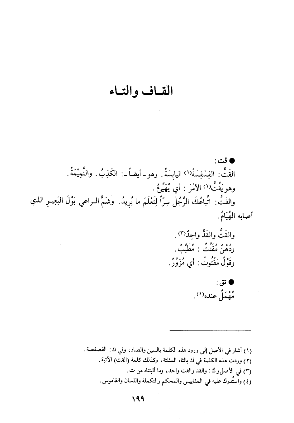 قت القَتُّ : الفِسْفِسَةُ اليابِسَةُ . وهو - أيضاً - : الكَذِبُ . والنَّمِيْمَةُ . وهو يَقُتُّ الأمْرَ : أي يُهيئُ . والقَتُّ : اتِّباعُكَ الرَّجُلَ سِرّاً لِتَعْلَمَ ما يُرِيدُ . وشمُ الراعي بَوْلَ البَعِيرِ الذي أصابه الهُيَامُ . والقَتًّ والقَدُّ واحِدٌ . ودُهْنٌ مُقَتَّت : مُطَيَّبٌ . وقَوْلٌ مَقْتُوت : أي مُزَوَّر . تق مُهْمَلٌ عنده .