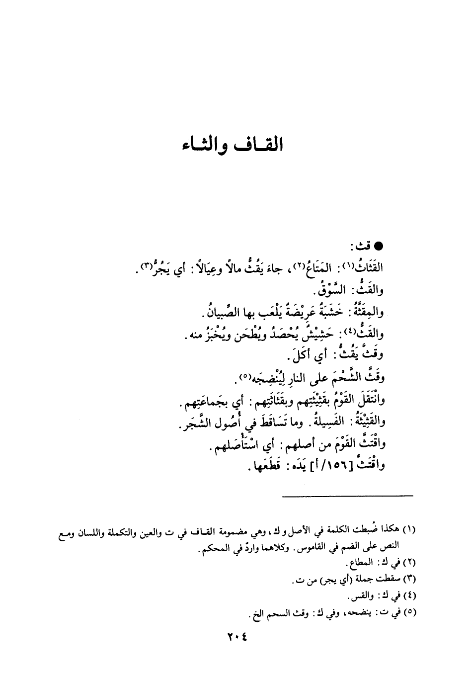 قث القَثَاثُ : المَتَاعُ ، جاءَ يَقُث مالاً وعِيَالاً : أي يَجُرُّ . والقَثُّ : السوْقُ . والمِقَثَّةُ : خَشَبَةٌ عَرِيْضَةٌ يَلْعَب بها الصَبيانُ . والقَث : حَشِيْشٌ يُحْصَدُ ويُطْحَن ويُخْبَزُ منه . وقث يَقُث : أي أكَلَ . وقث الشحْمَ على النار لينْضِجَه . وانْتَقَلَ القَوْمُ بقَثِيْثَتِهم وبقَثَاثَتِهم : أي بجَماعَتِهم . والقَثِيْثَةُ : الفَسِيلةُ . وما تَسَاقَطَ في أصول الشَجَر . واقْتَث القَوْمَ من أصلهم : أي اسْتَأصَلهم . واقْتثَّ يَدَه : قَطَعَها .