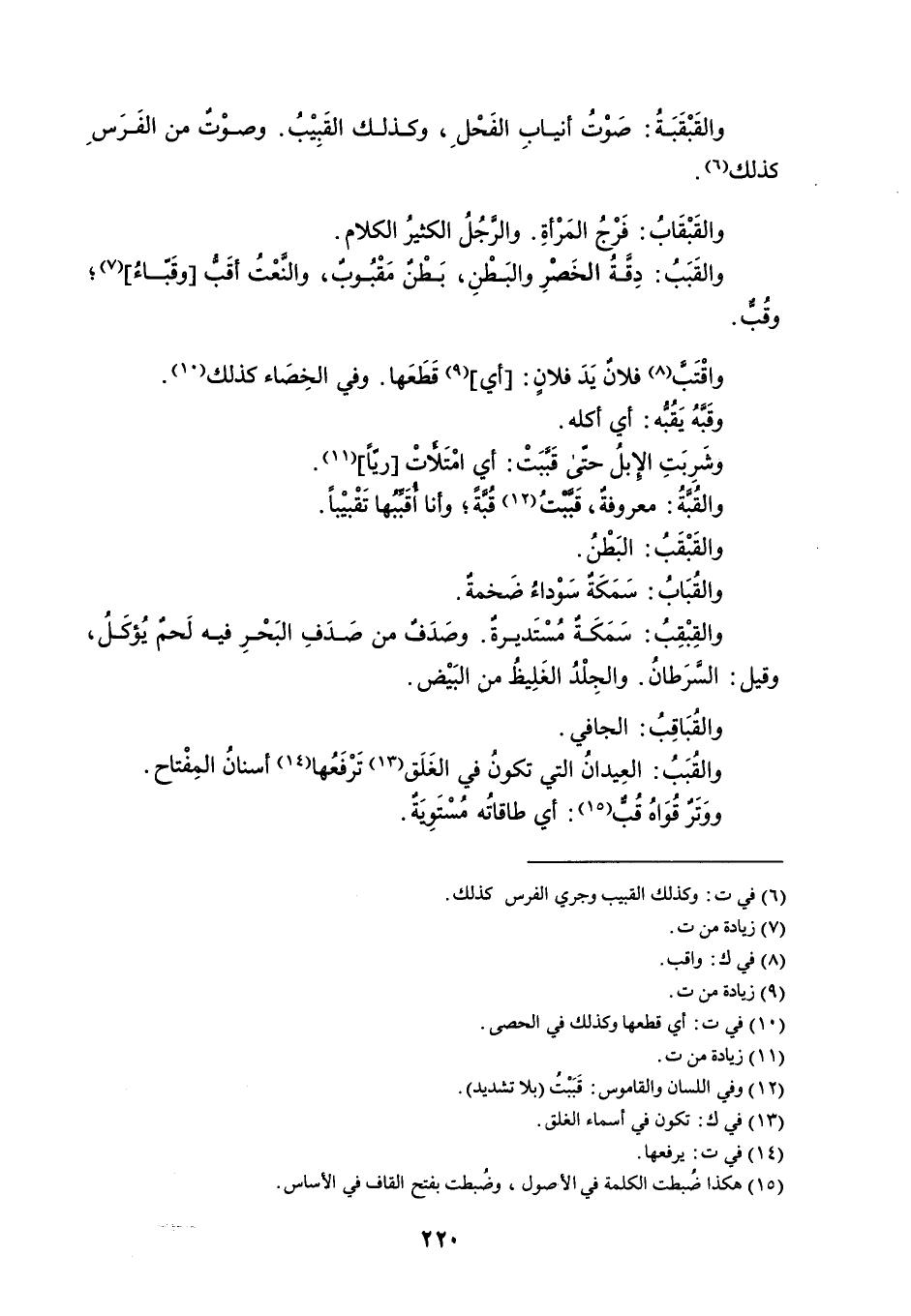 والقَبْقَبَةُ : صَوْتُ أنيابِ الفَحْل ، وكذلك القَبِيْبُ . وصوْتٌ من الفَرَس كذلك . والقَبْقَابُ : فَرْجُ المَرْأةِ . والرجُلُ الكثيرُ الكلام . والقَبَبُ : دِقَةُ الخَصْرِ والبَطْنِ ، بَطْن مَقْبُوبٌ ، والنَّعْتُ أقَبُّ وقَباءُ وقب . واقْتَبَّ فلان يَدَ فلانٍ : أي قَطَعَها . وفي الخِصَاء كذلك . وقَبهُ يَقُبُّه : أي أكله . وشَرِبَتِ الإِبلُ حتّىِ قَببَتْ : أي امْتَلأتْ رياً . والقبةُ : معروفة ، قَبَبْتُ قُبَّةً ؟ وأنا أقببُها تَقْبيْباً . والقَبْقَبُ : البَطْنُ . والقُبَابُ : سَمَكَةٌ سَوْداءُ ضَخمةٌ . والقِبْقِبُ : سَمَكَة مُسْتَديرة . وصَدَفٌ من صَدَفِ البَحْرِ فيه لَحمٌ يُؤكَل ، وقيل : السَّرَطانُ . والجِلْدُ الغَلِيظُ من البَيْض . والقُبَاقِبُ : الجافي . والقُبَبُ : العِيدان التي تكونُ في الغَلَق تَرْفَعها أسنانُ المِفْتاح . ووترٌ قوَاهُ قُب : أي طاقاتُه مُسْتَوِيةٌ .