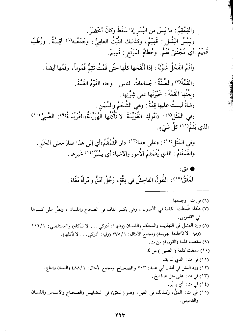 والقِمْقِمُ : ما يَبِسَ من البُسْرِ إذا سَقَطَ وكانَ أخْضَرَ . ويَبِيْسُ البَقْل : قَمِيْم ، وكذلك النَّبْتُ العامِيُّ ، وجَمْعُه أقِمَّةُ . ورُطَبٌ قَمِيْمٌ : أي مُجْتَنىً يُقَمُّ . وحُطامُ المَرْتَع : قَمِيم . وأقَمَّ الفَحْلُ شَوْلَهُ : إذا ألْقَحَها كلَّها حتّى قمَّتْ تَقِمُّ قُمُوماً ، وقَمَّها أيضاً . والقَفَةُ والضَّفَّةُ : جَماعا الناس . وجاءَ القَوْمُ القَمَّةَ . وبِعْتُها القَمَّةَ : خَيْرَتَها على شِرَّتِها . وشاةٌ ليستْ عليها قِمَّةٌ : وهي الشَّحْمُ والسِّمَنِ . وفي المَثَل : ' أدْرِكِ القُوَيِّمَةَ لا تأكُلُها الهُوَيِّمَةُ ' القُوَيِّمَةُ : الصَّبِيًّ الذي يَقُمُّ كلَّ شَيْءٍ . وفي المَثَل : ' على هذا دار القُمْقُمُ ' أي إلى هذا صارَ معنى الخَبَرِ . والقَمْقَامُ : الذي يُقَمْقِمُ الأمورَ والأشياءَ أي يَسْبُرُ خَبَرَها . مق المَقَقُ : الطًّولُ الفاحِشُ في دِقَّةٍ ، رَجلٌ أمَقُّ وامْرأةٌ مَقّاءُ .