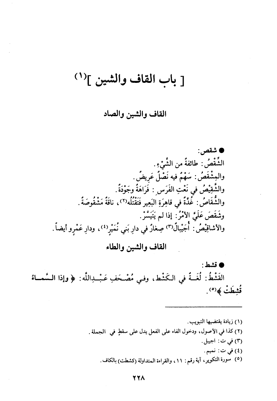 شقص الشِّقْصُ : طائفةٌ من الشَّيْءِ . والمِشْقَصُ : سَهْمٌ فيه نَصْلٌ عَرِيضٌ . والشَّقِيْصُ في نَعْتِ الفَرَس : فَرَاهَةٌ وجَوْدةٌ . والشُّقَاصُ : غدَةٌ في قاهِرَةِ البَعِير فَتَقْتُلُه ، ناقَة مَشْقوصَةٌ . وشَقَصَ عَلَيَّ الأمْرُ : إذا لم يَتَيَسَّرْ . والأشاقِيْصُ : أجَيْبال صِغار في دارِ بَني نُمَيْرٍ ، ودارِ عَمْرٍو أيضاً .